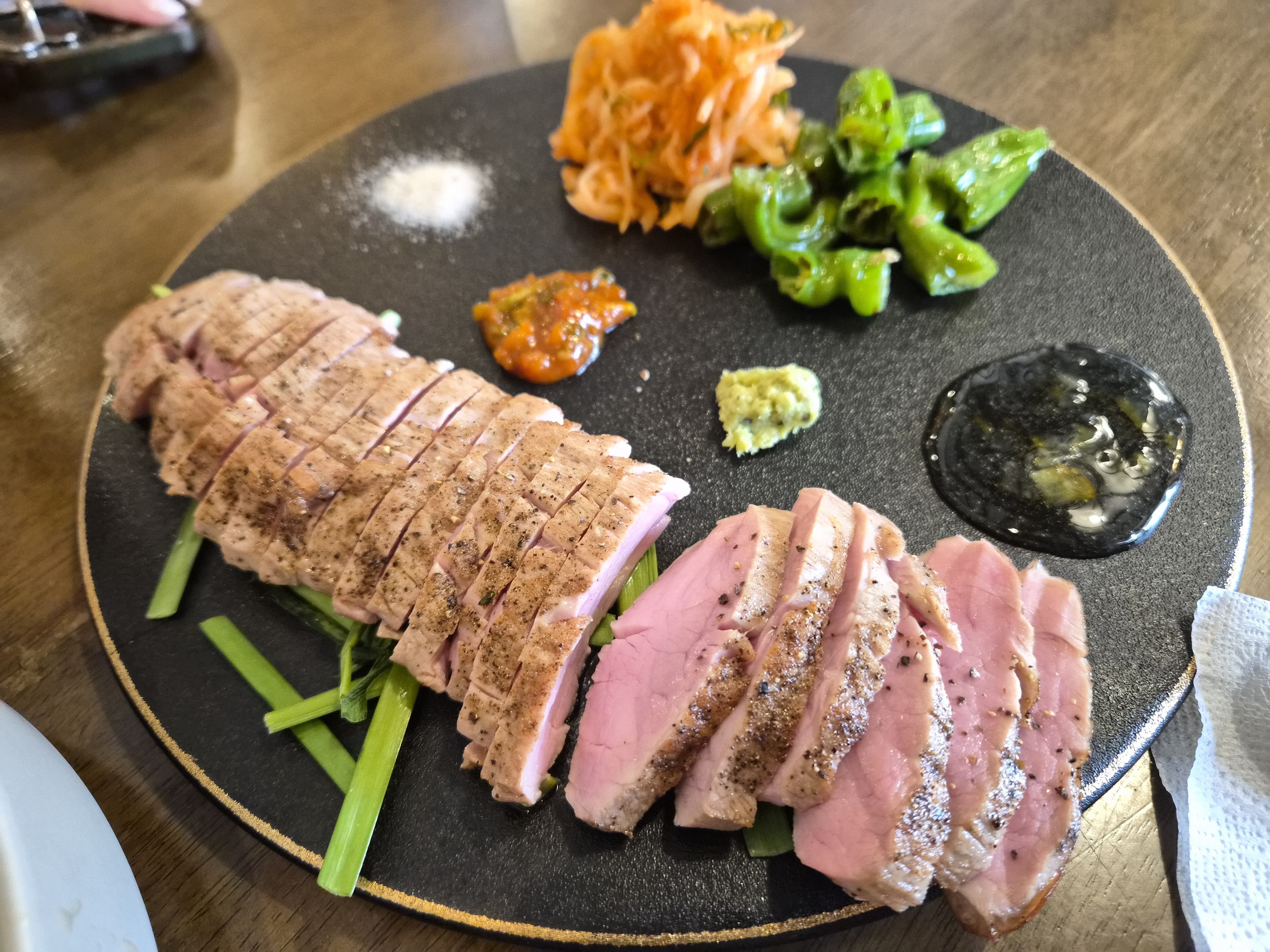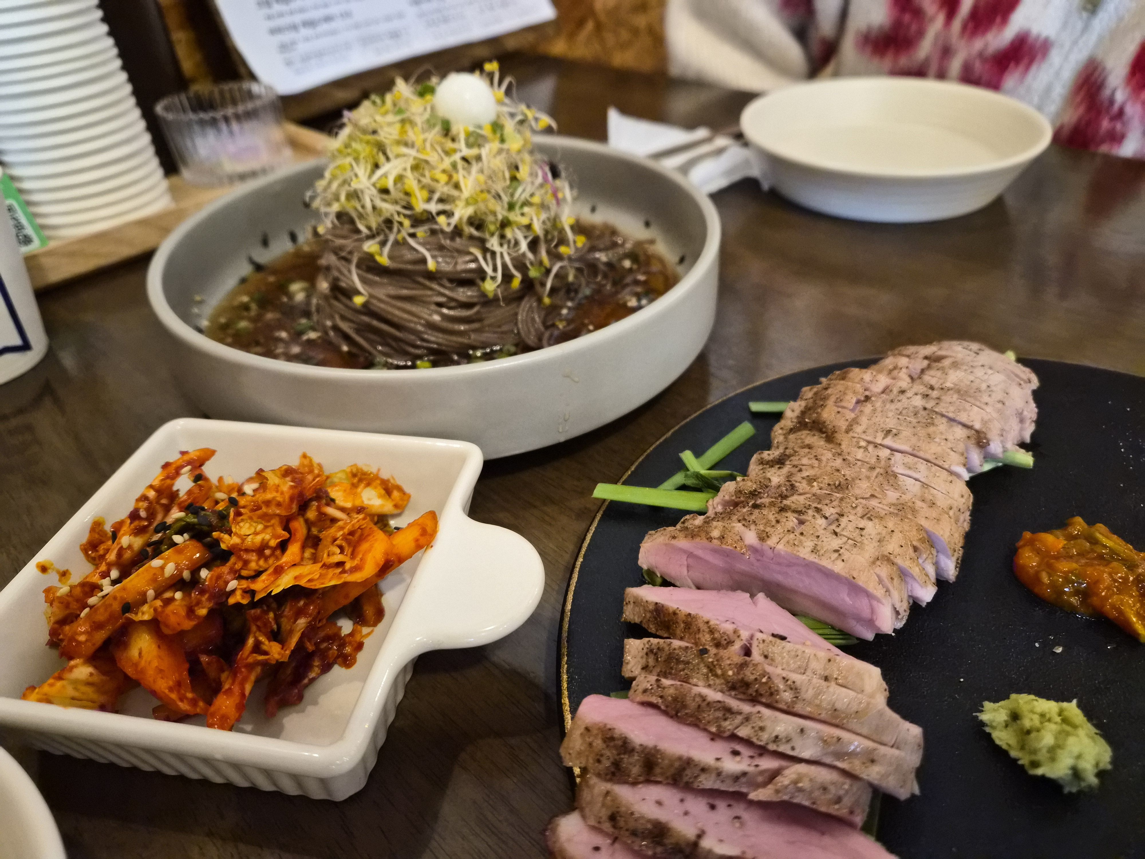 같이 나온 소스들도 인상적이다. 짭짤한 소스, 산뜻한 소스, 알싸한 소스까지 하나하나 성격이 달라서 고기를 먹을 때마다 다른 조합으로 즐길 수 있다. 특히 메밀막국수와 함께 먹었을 때 궁합이 정말 좋았다. 담백한 막국수에 고기의 풍미가 더해지면서 전체적인 식사의 완성도가 확 올라간다.