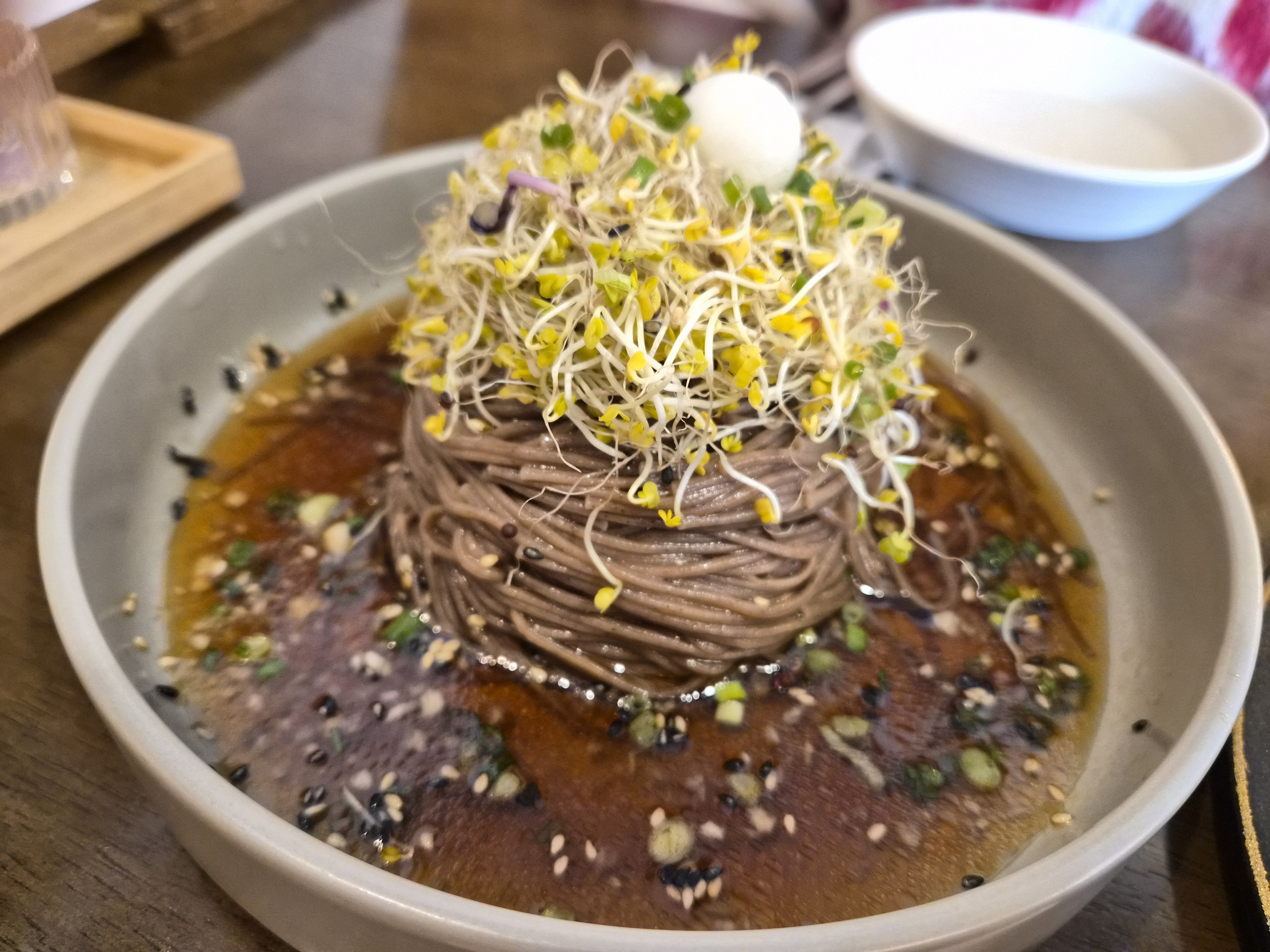 젓가락으로 면을 풀어보면 메밀 특유의 거친 듯 부드러운 질감이 그대로 살아 있다. 한 입 먹자마자 느껴지는 건 간장의 짠맛이 아니라, 메밀 향과 감칠맛이다. 간장막국수인데도 전혀 부담스럽지 않고, 오히려 계속 먹게 되는 타입. 콩나물의 아삭함이 더해지면서 식감도 단조롭지 않다.
