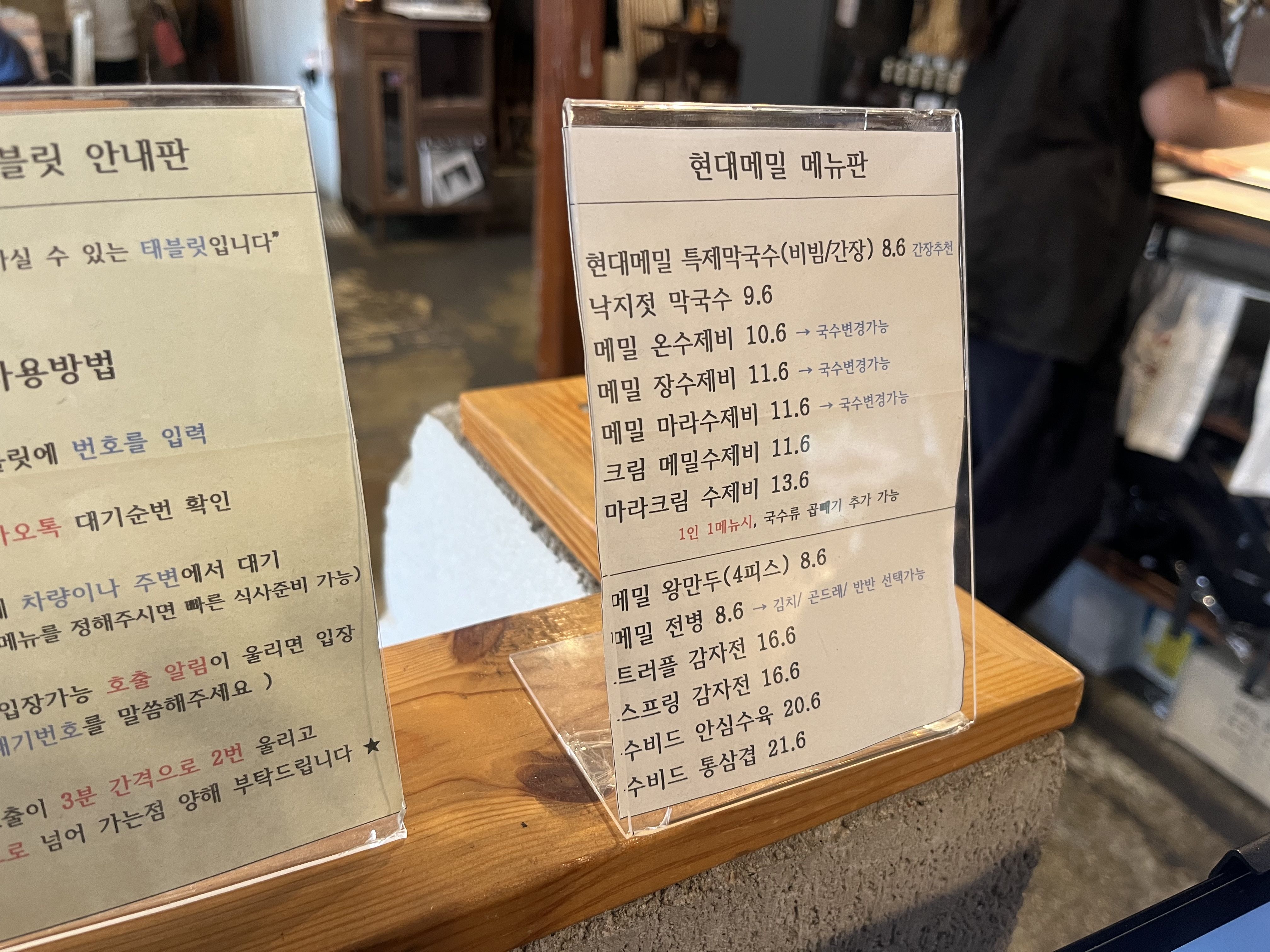 실내는 생각보다 아늑하고 조용한 편이다. 관광객으로 북적이는 느낌보다는, 음식에 집중할 수 있는 분위기라서 마음에 들었다. 메뉴판을 보면서 고민했지만, 첫 방문이니 가장 기본이자 시그니처인 현대메밀 특제간장막국수와 수비드 안심수육을 주문했다.