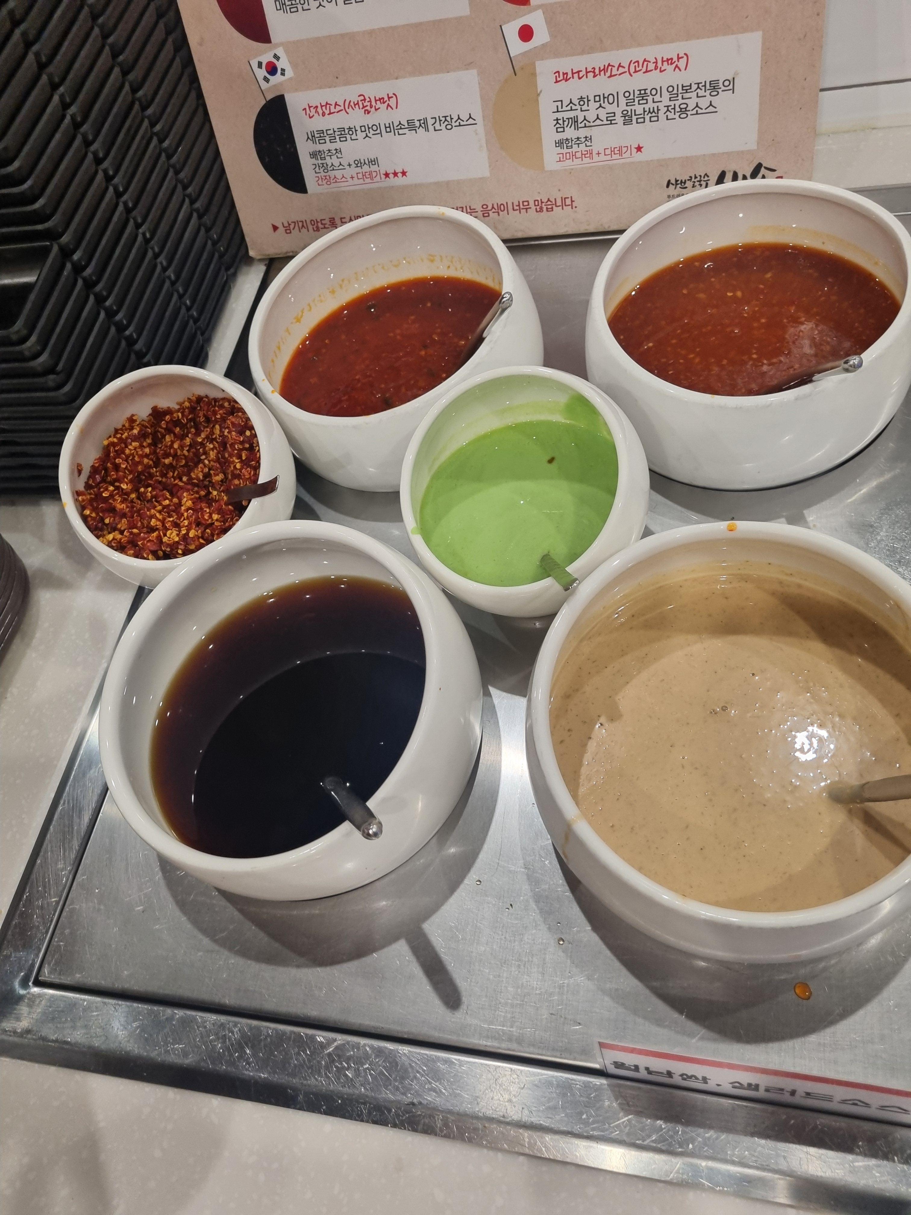 소스 코너도 꽤 잘 되어 있었어요. 기본 간장 베이스부터 매콤한 소스, 고소한 소스까지 준비돼 있어서 취향 따라 조합하기 좋아요. 저는 간장 베이스에 마늘, 고추, 파 조금 넣고, 고소한 소스도 살짝 섞어 먹는 조합이 제일 맛있었어요.