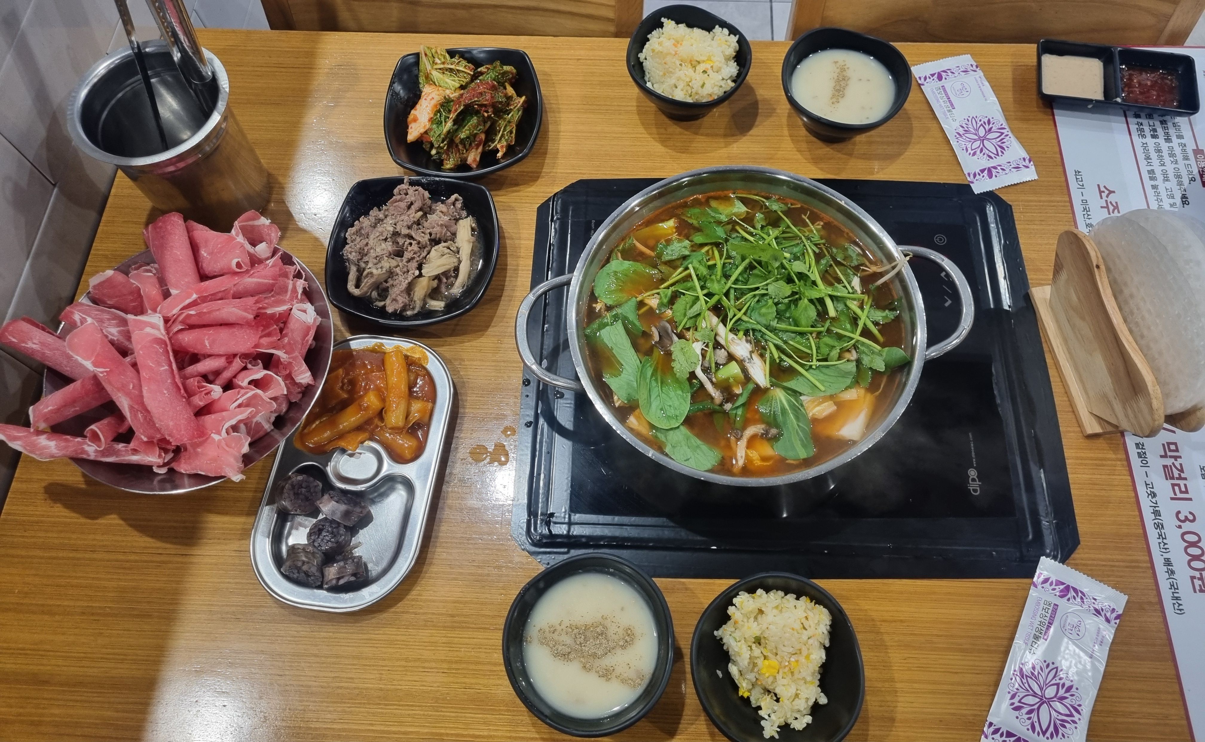 문 열고 들어가자마자 느껴지는 분위기는 딱 깔끔한 샤브샤브집 그 자체였어요. 테이블 간 간격도 답답하지 않고, 가족 단위 손님부터 커플, 친구들까지 다양하게 앉아 있더라고요. 특히 인상적이었던 건 전체적으로 정리가 잘 되어 있다는 느낌이었어요. 무한리필 집이다 보니 정신없을 거라 생각했는데, 생각보다 차분하고 동선도 잘 짜여 있어서 편했어요.