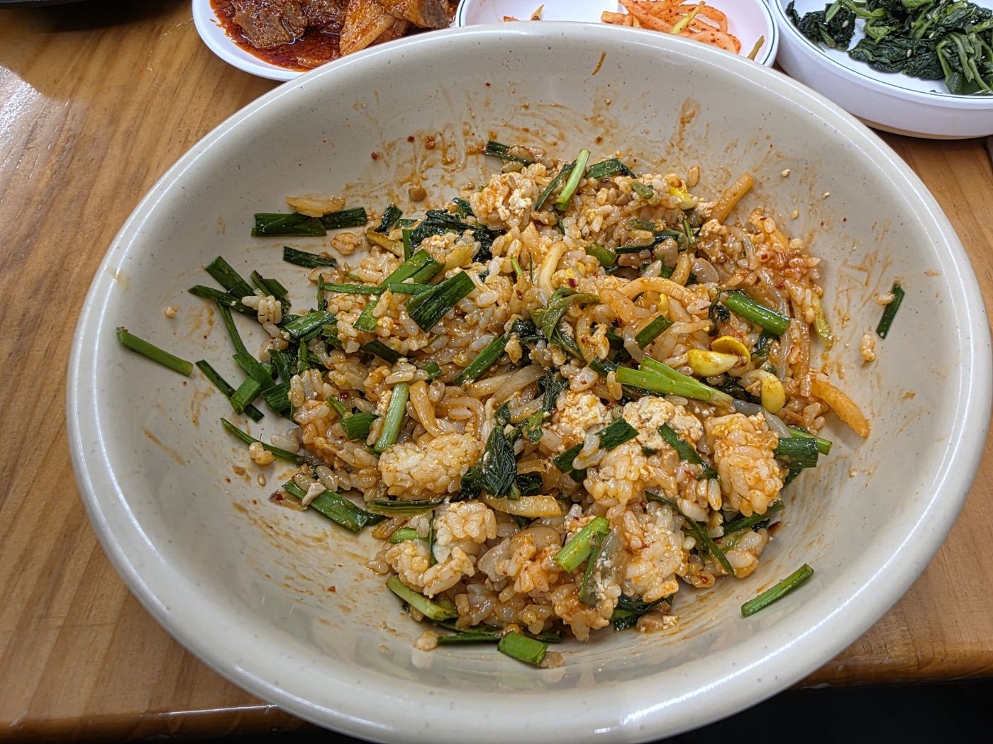 이 두 메뉴가 함께 놓이니까 자연스럽게 ‘비벼 먹기’가 시작된다. 큰 그릇에 밥을 옮겨 담고, 부추무침 조금, 콩나물무침 조금, 시래기나물 한 숟갈, 그 위에 제육볶음 듬뿍 얹고 마지막으로 청국장 국물을 한 국자. 따로 설명하지 않아도 몸이 먼저 기억하는 조합이다.