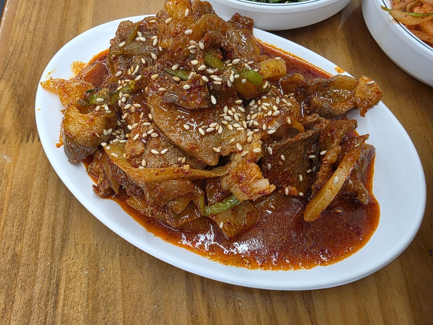 양념이 자극적이지 않다. 흔히 생각하는 빨갛고 매운 제육볶음이 아니라, 고기 맛이 먼저 느껴지는 스타일이다. 불맛은 은근하게만 살아 있고, 기름기가 과하지 않아서 먹다 보면 젓가락이 멈추지 않는다. 고기도 질기지 않고 부드러워서 밥이랑 같이 먹기 좋다.