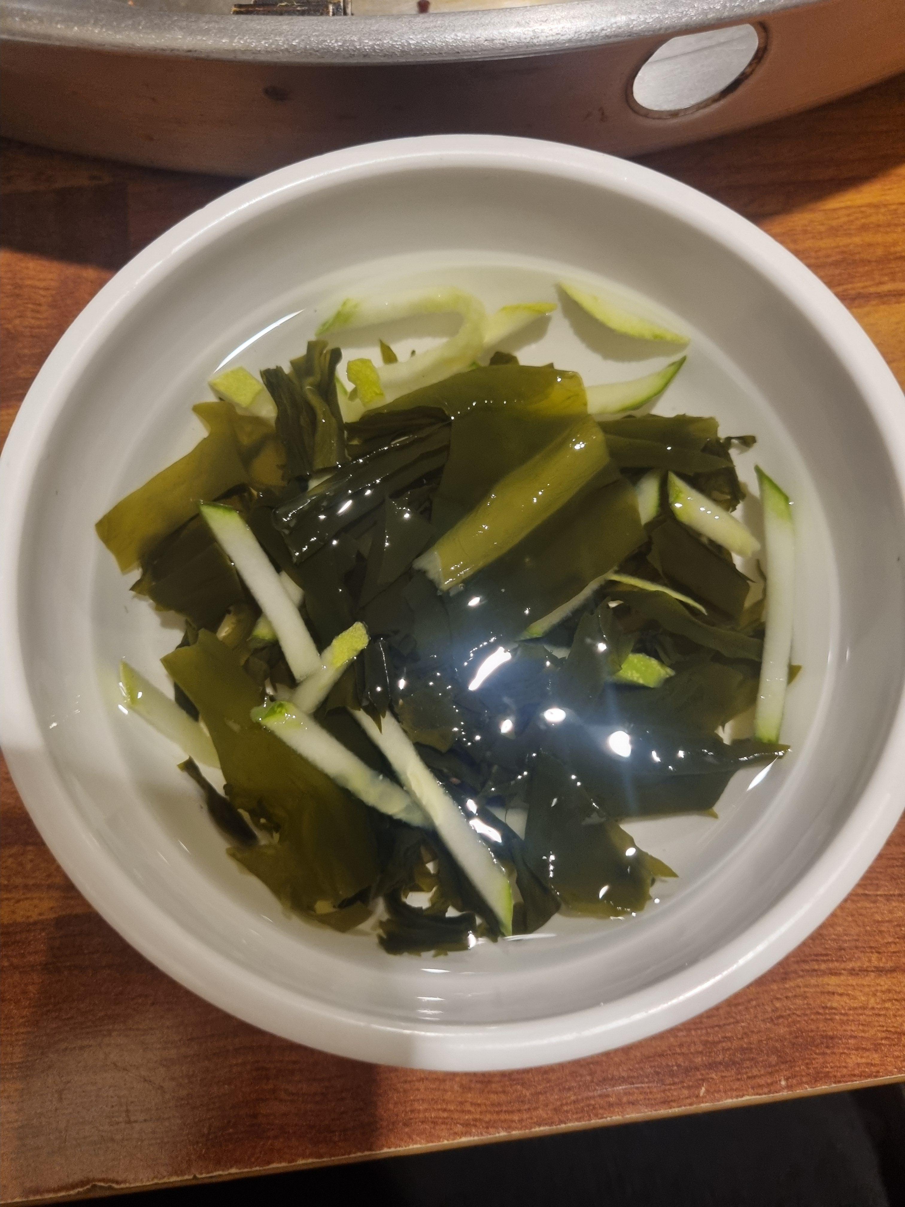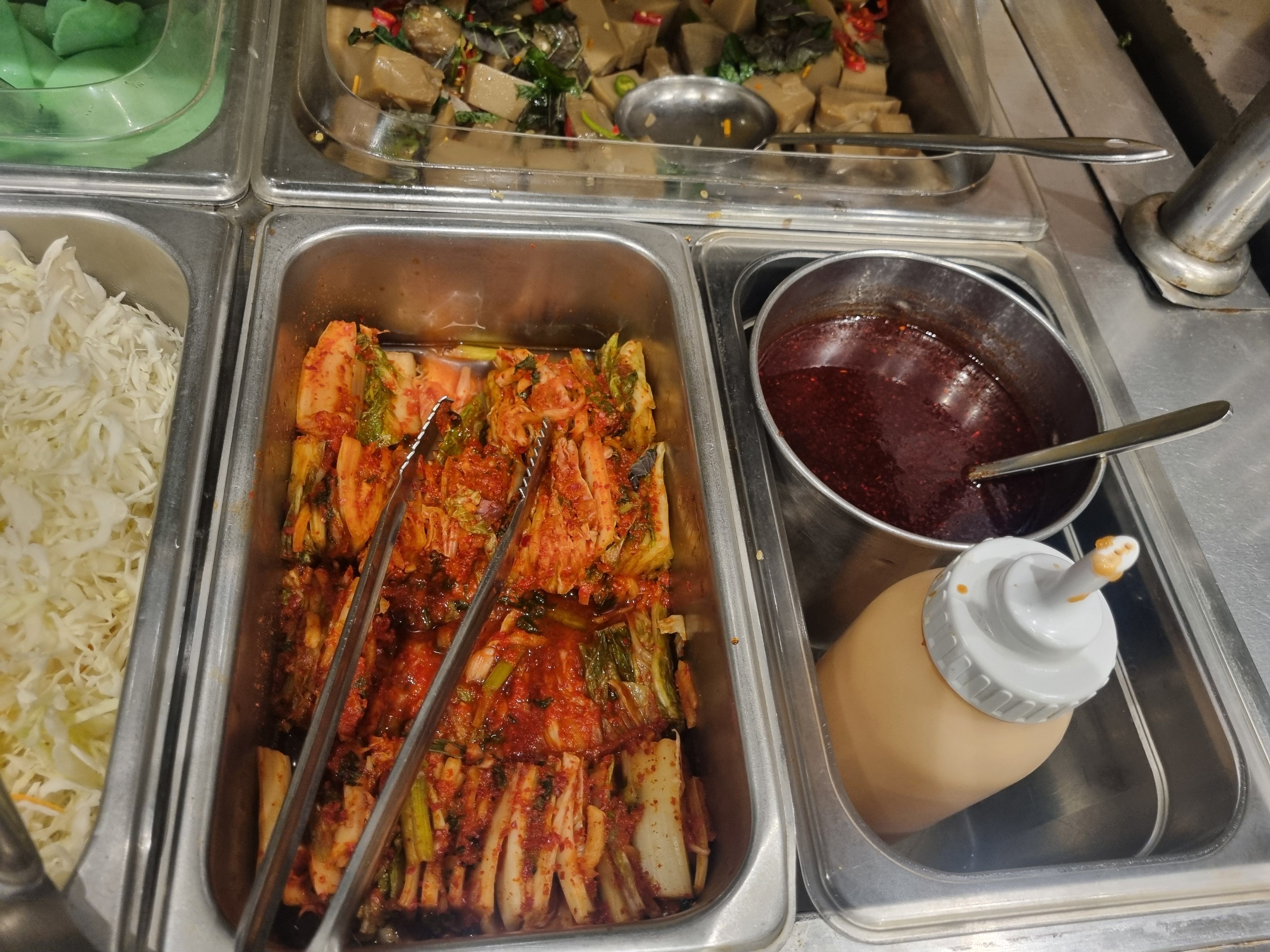 사진에서 보이는 무절임, 샐러드, 미역냉국, 묵 같은 기본 반찬들이 쭉 준비되어 있었고