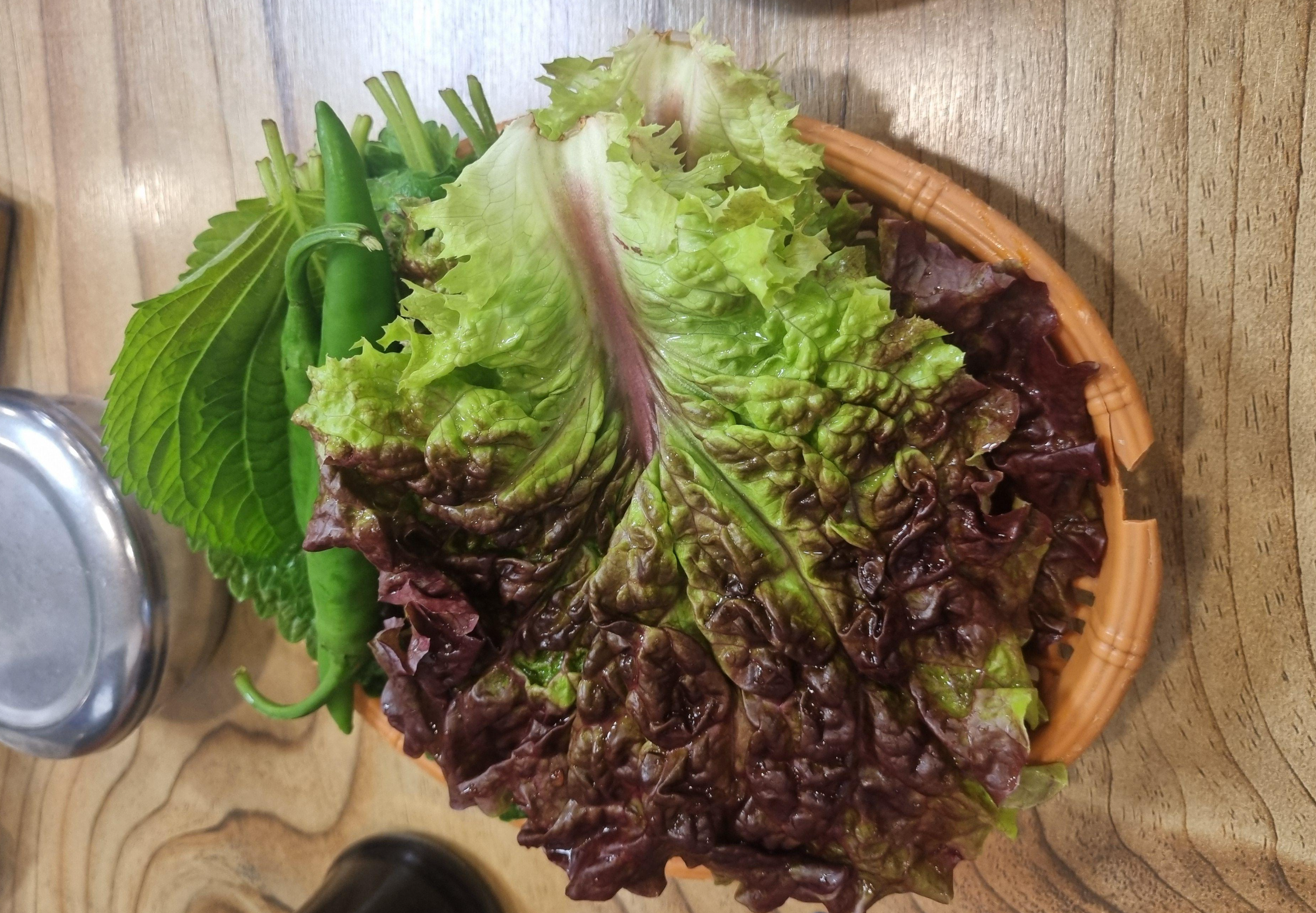 자리에 앉자마자 먼저 나오는 건 작은 바구니에 수북하게 담긴 상추, 깻잎, 고추들. 색감부터가 진짜 싱그러워. 겉잎이 축 처진 애들 하나도 없이, 초록·보라 컬러 선명한 상추가 푸짐하게 쌓여 있고, 그 뒤로 깻잎이랑 아삭한 청양고추가 꾸깃꾸깃 고개를 내밀고 있어.