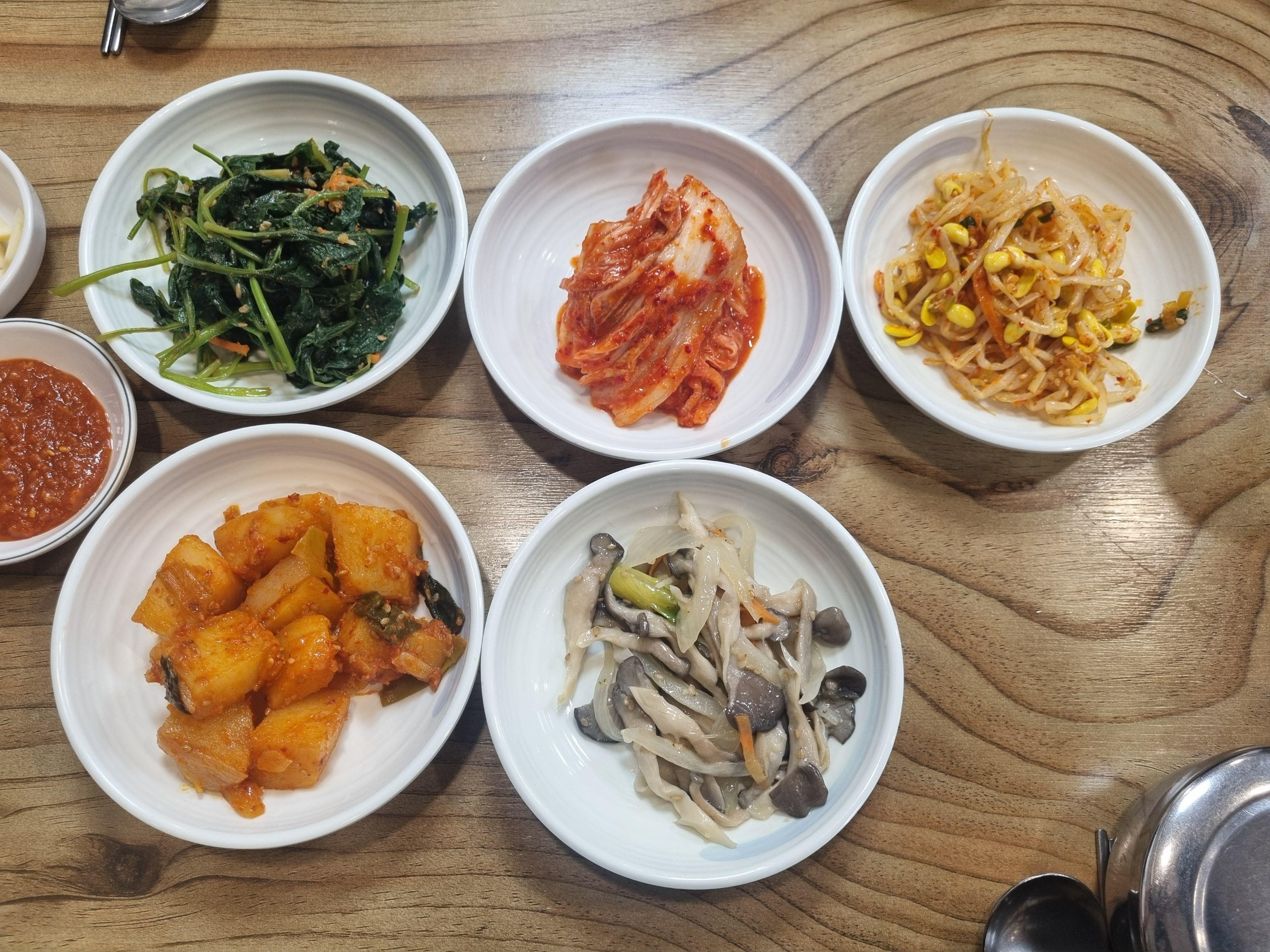 밑반찬은 날마다 살짝씩 바뀌는 것 같은데, 내가 갔을 땐 깍두기, 시금치나물, 콩나물무침, 버섯볶음, 배추김치가 기본 세팅이었어.