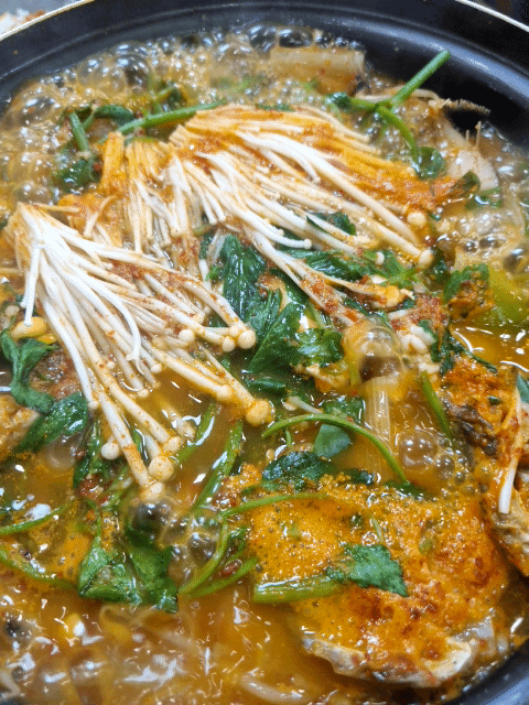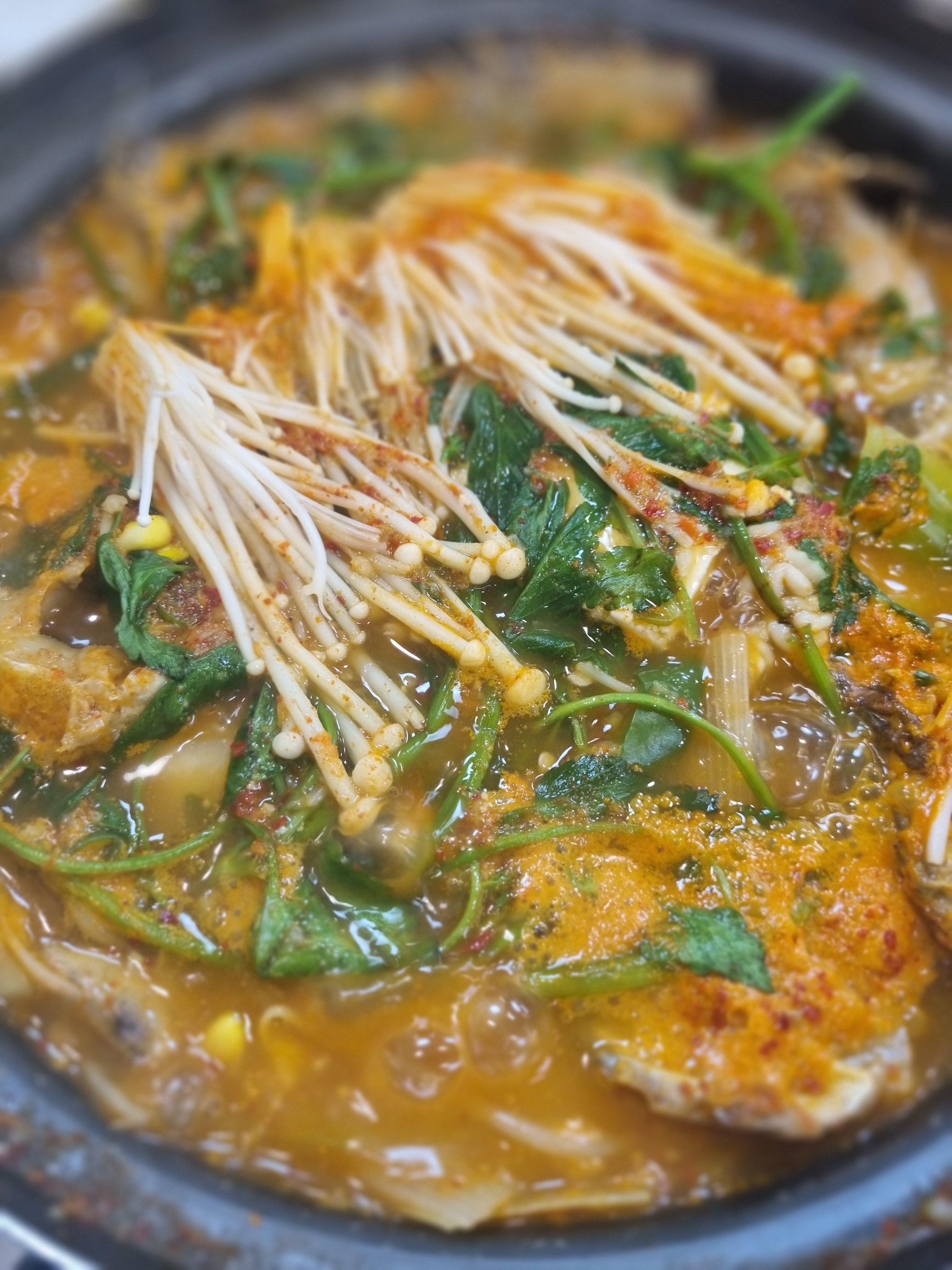 뚝배기째 보글보글 끓으면서 나오는데, 위에는 미나리랑 팽이버섯이 한가득 올라가 있고, 국물 색이 벌써부터 “나 얼큰해요”라고 선언하는 기분이야. 살짝 빨갛게 기름이 떠 있는데 탁하거나 느끼해 보이지 않고, 깨끗하게 맑으면서도 깊어 보이는 컬러.