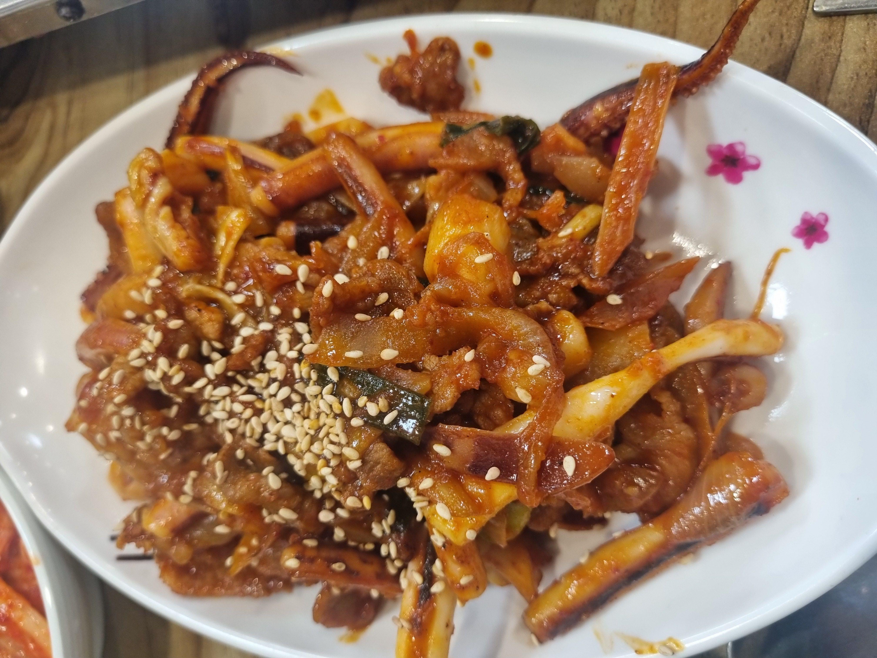 다음으로 나온 건 사진만 봐도 침 고이게 만드는 오삼불고기. 두툼한 오징어 다리랑 몸통, 그리고 삼겹살이 매콤한 양념에 잔뜩 볶아져서 나왔어. 위에는 고소한 깨가 팍팍.