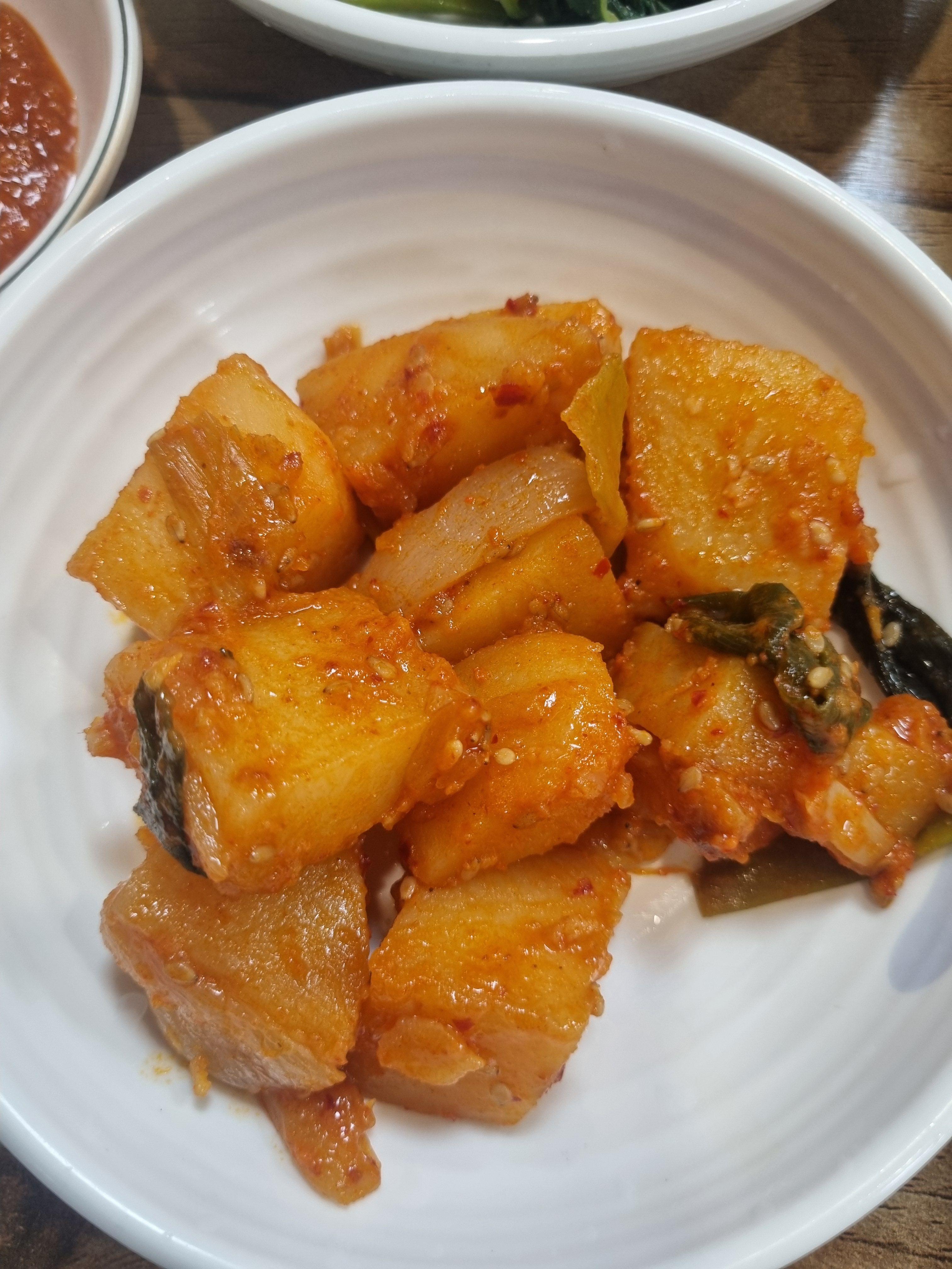백반집 가면 쌈 채소가 ‘있긴 있는데 마음껏 먹기엔 살짝 눈치 보이는’ 느낌일 때도 있잖아. 근데 정주식당은 그냥 처음부터 “오늘 고기든 생선이든 실컷 싸먹어라~” 하는 느낌으로 퍼주더라. 나중에 생선구이랑 오삼불고기 싸먹을 생각하니까 벌써부터 행복지수 올라감.
