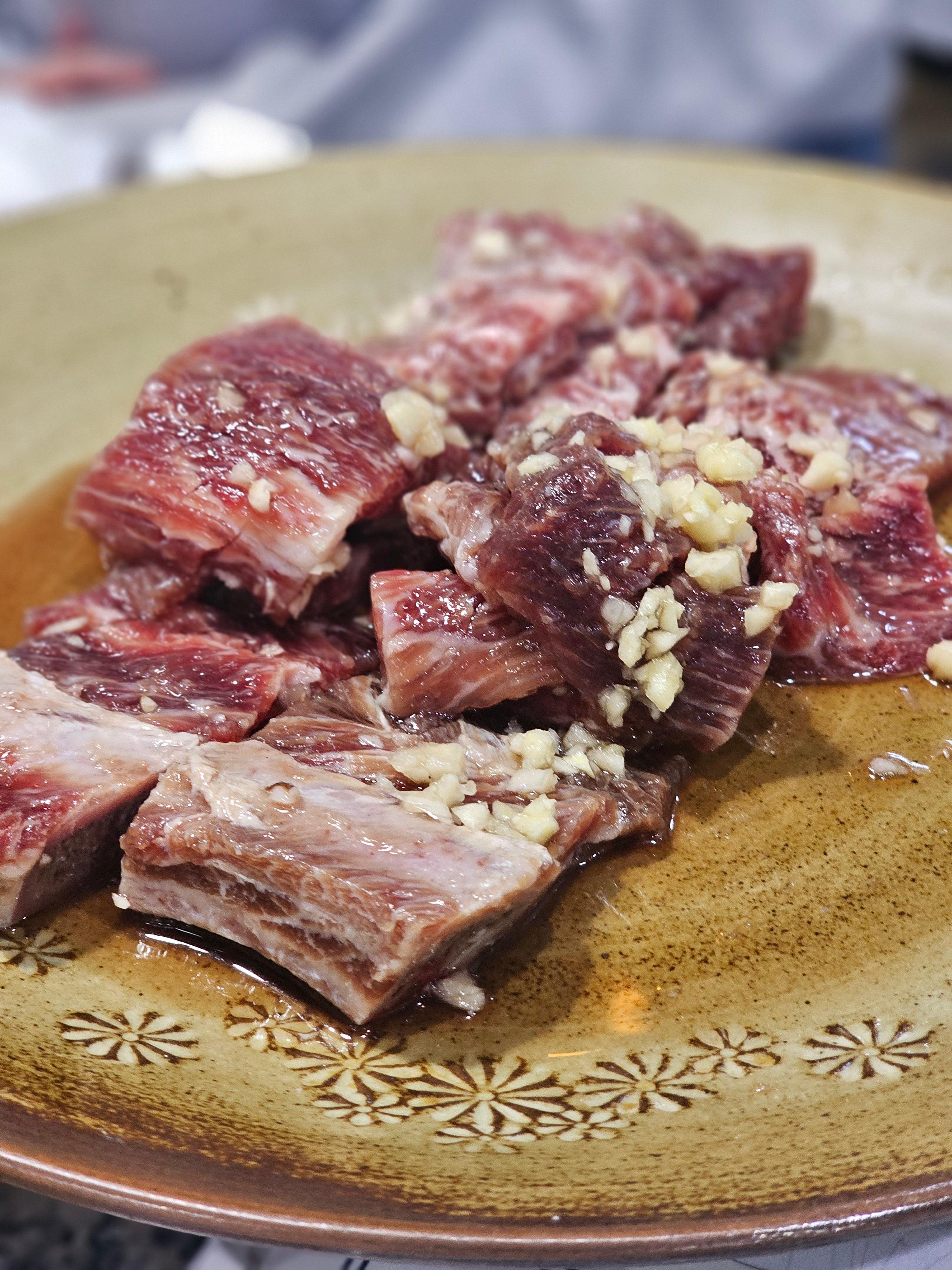 처음 상 위에 올라온 갈비를 보자마자 “이 집은 고기 제대로 한다”라는 생각이 절로 들었어요. 마블링 자체가 번들거리는 기름기 느낌이 아니라, 고소한 지방이 결 사이사이에 자연스럽게 배어 있는 느낌. 여기에 다진 마늘이 적당히 뿌려져 있는데, 마늘 향이 과하지 않고 고기 자체 풍미를 끌어올려 주는 조합이더라구요.