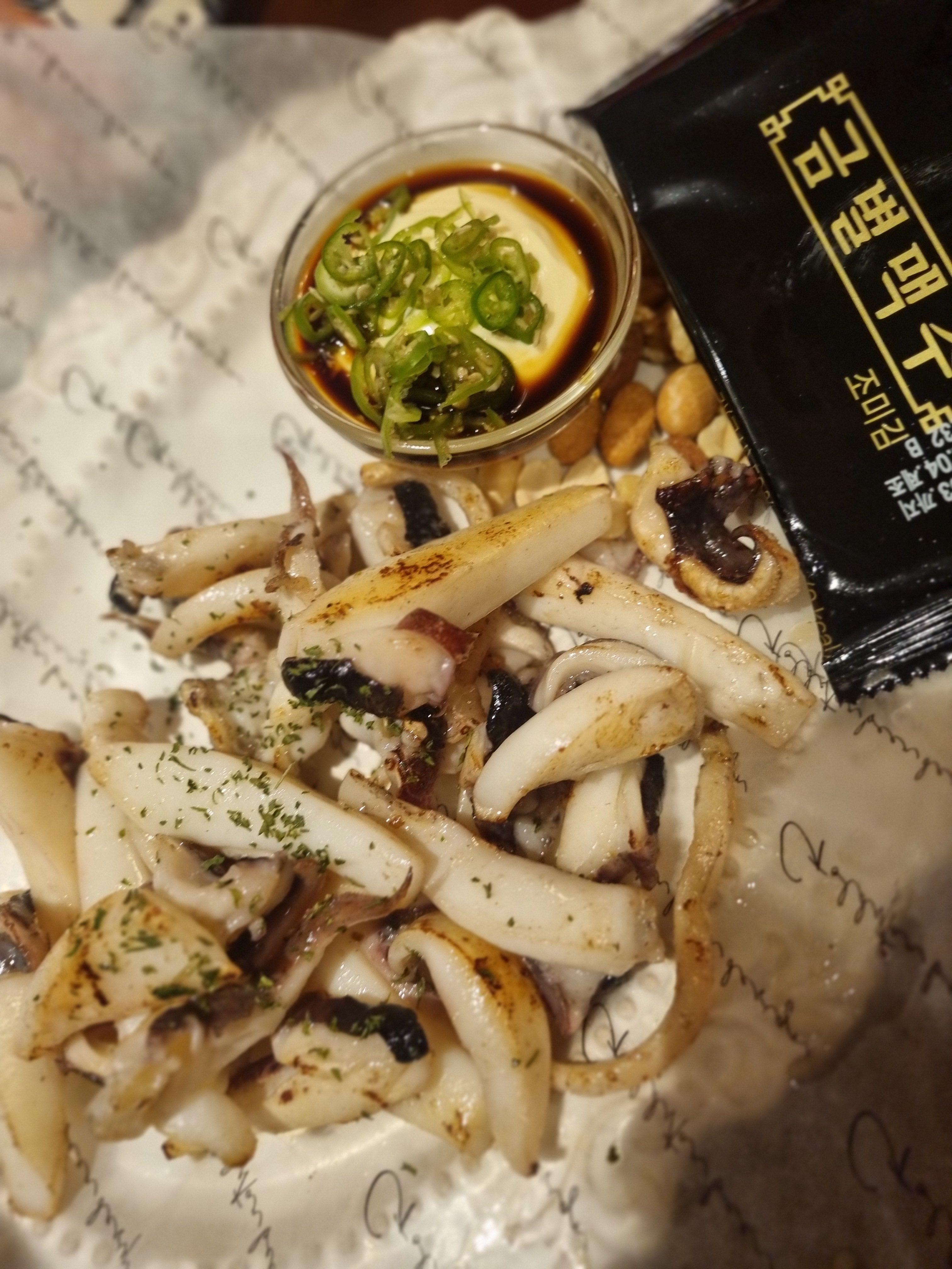 버터 향은 튀지 않게 깔려 있고, 마늘의 고소함이 은근하게 받쳐줘서 오히려 갑오징어 특유의 단맛이 더 살아나는 느낌이었어요. 질기지 않게 씹히는 식감이라 맥주 안주로도 좋고, 술 안 마시는 사람도 충분히 맛있게 먹을 수 있는 구성이라는 생각이 들었어요.