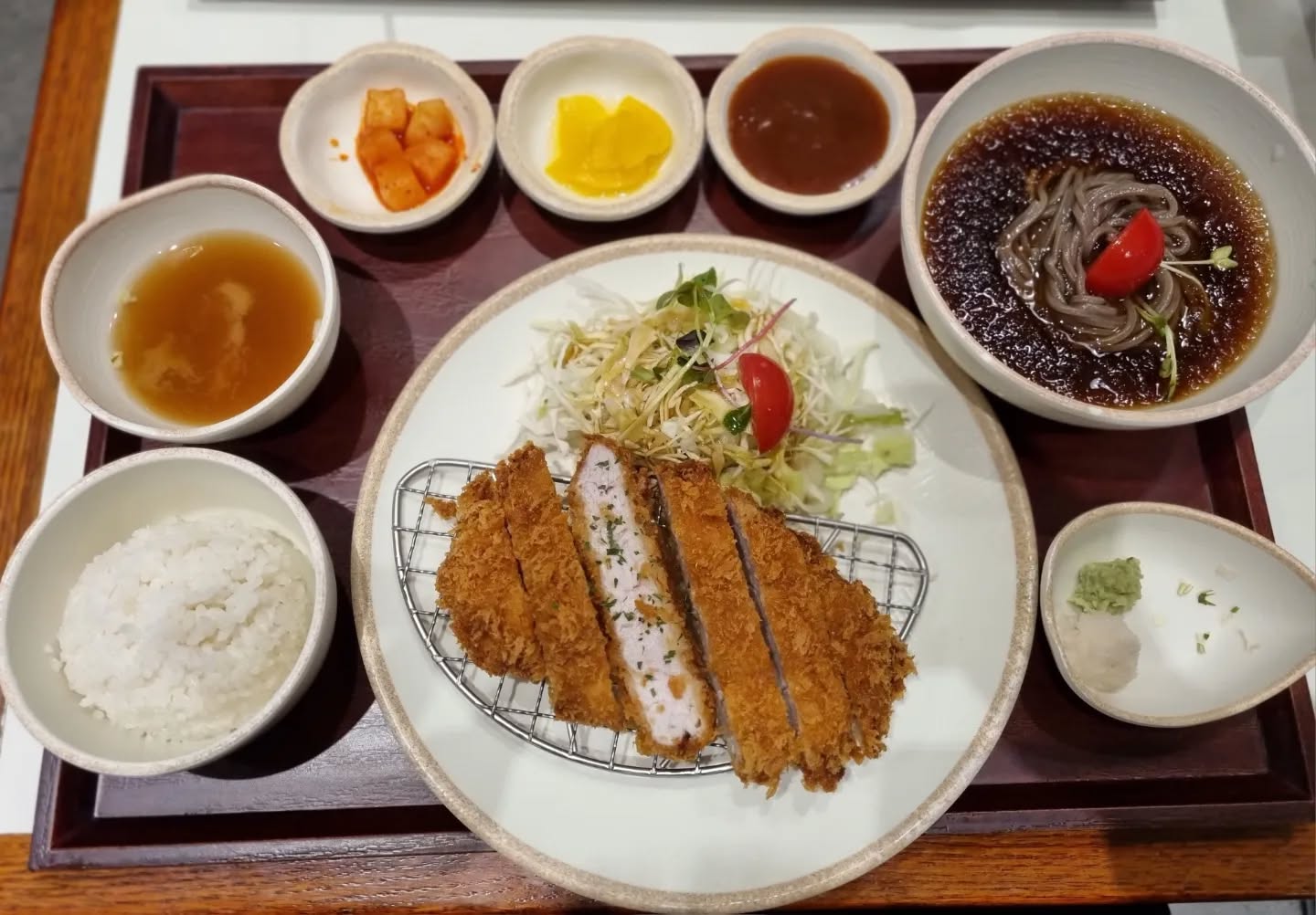 메뉴판을 보면서 뭘 먹을까 고민했는데, 우린 서로 취향이 달라서 하나는 돈카츠정식 우동 세트, 다른 하나는 돈카츠정식 냉소바 세트를 주문했어요. 테이블 위에 한 상 가득 차려진 순간부터 이미 행복해지는 느낌이었죠. 깍두기, 단무지, 샐러드, 장국까지 기본 반찬 구성도 깔끔하고 푸짐했어요.