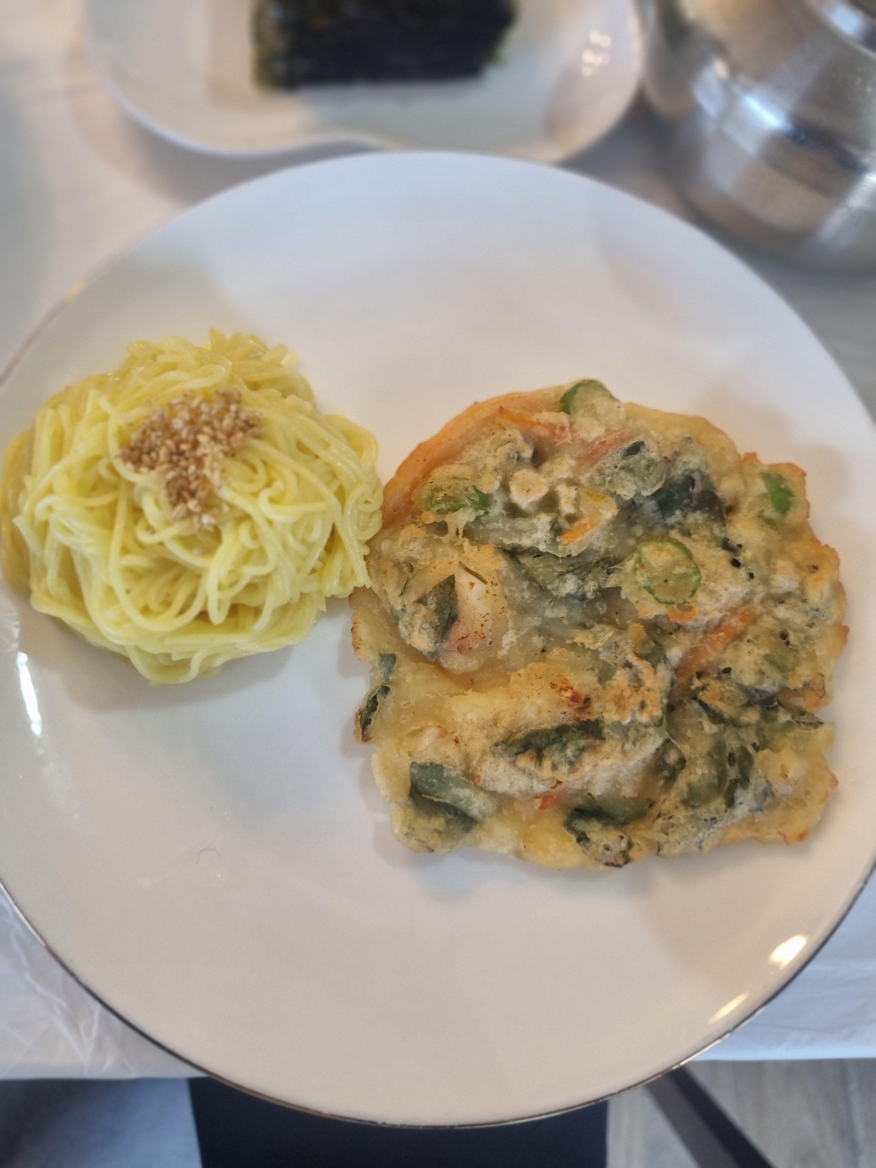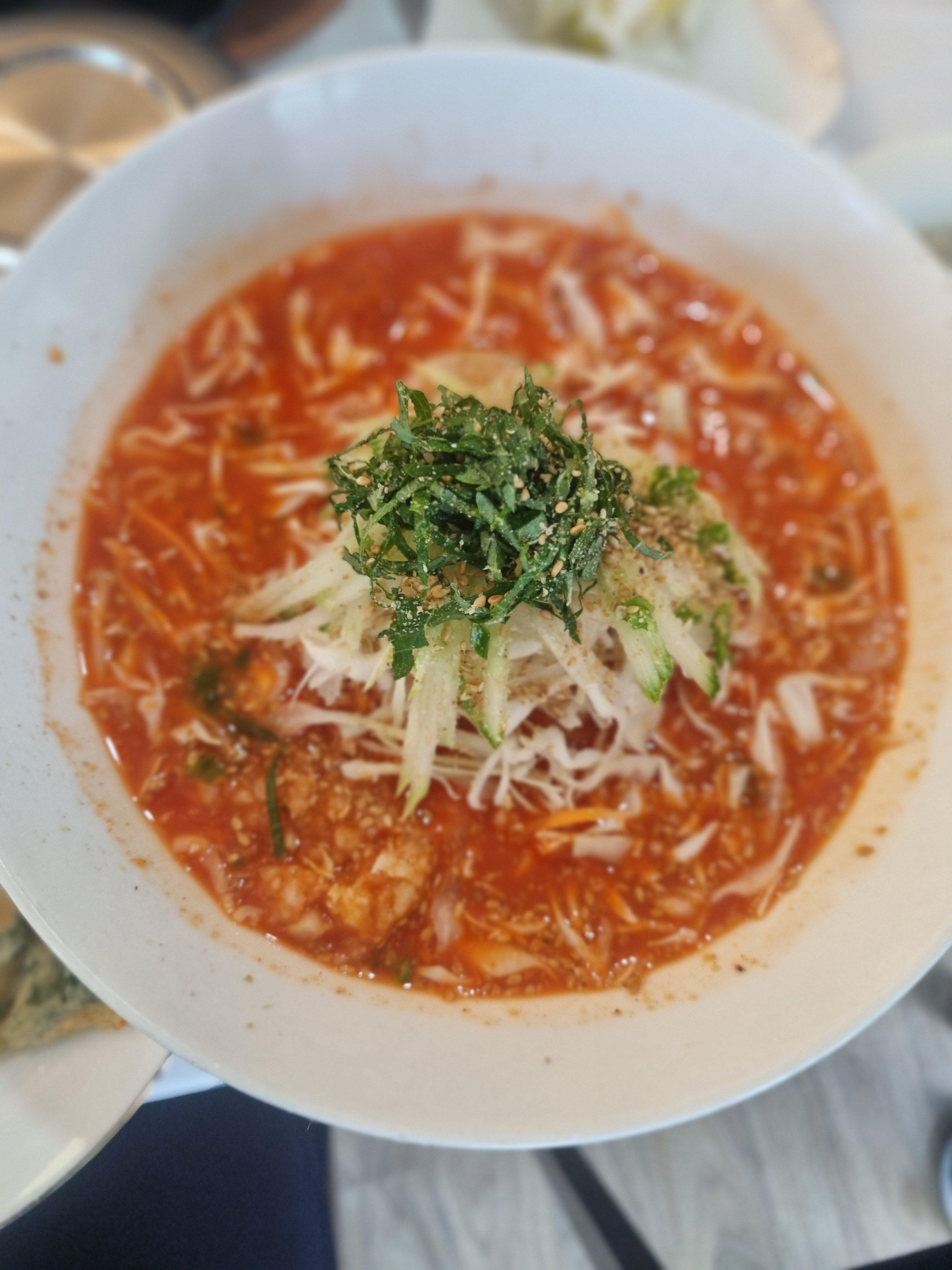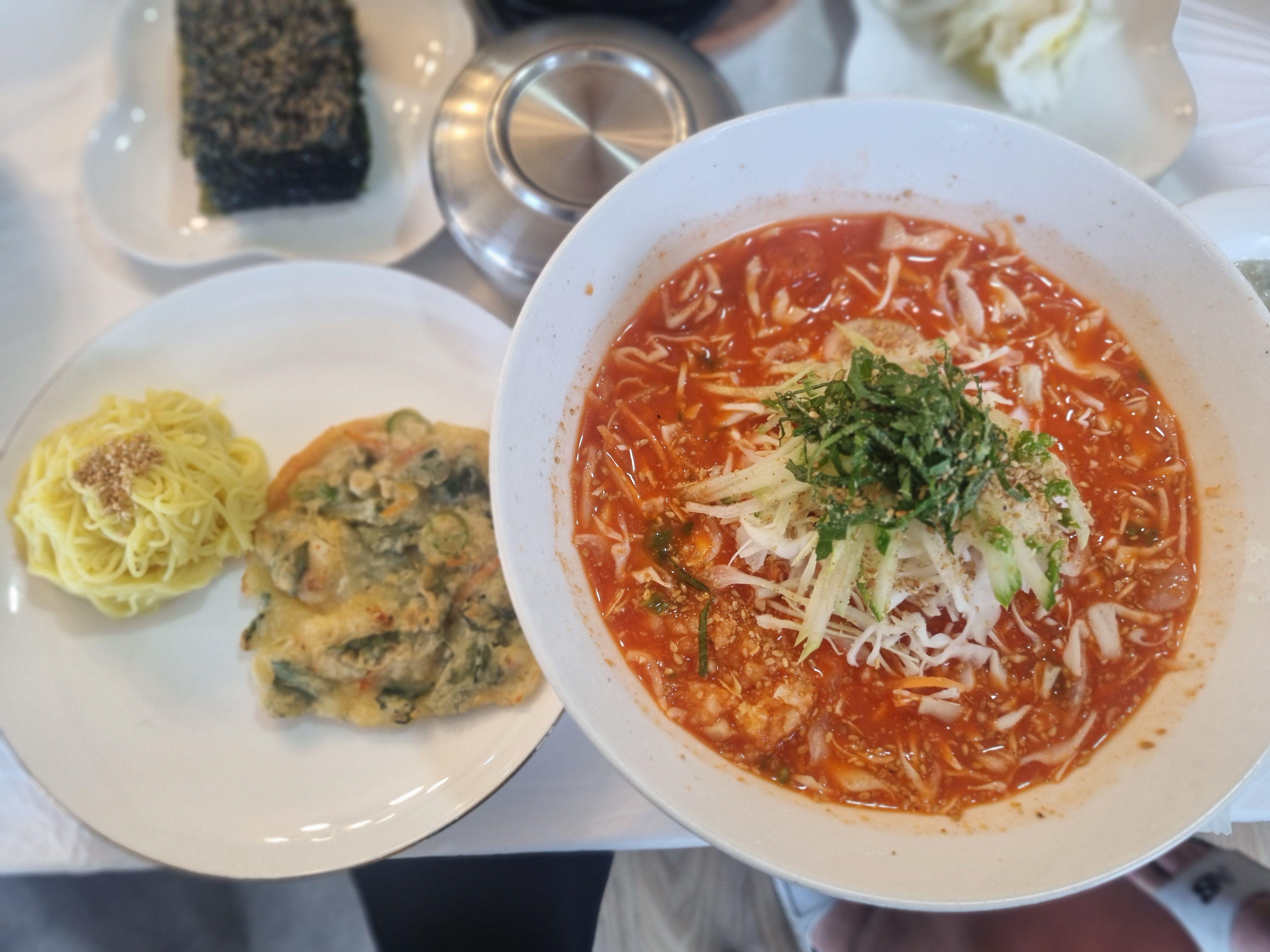 같이 간 일행은 물회를 주문했는데요, 이건 양양 바다를 그대로 담은 맛… 저는 비린걸 못먹어서 좀 비린향이 있어서 국물에 국수 말아 먹었어요. 새콤하고 칼칼한 육수에 채썬 야채, 생선회가 가득 들어있고 위엔 깻잎과 오이, 깨소금이 풍성하게 올라가 있어요. 비주얼부터 압도적이고, 맛은 더 말해 뭐해요. 같이 나온 국수 + 해물전 세트는 식감도 조화롭고 양도 넉넉했어요. 친구들은 비린맛을 못느꼈고 맛있게 먹더라고 요