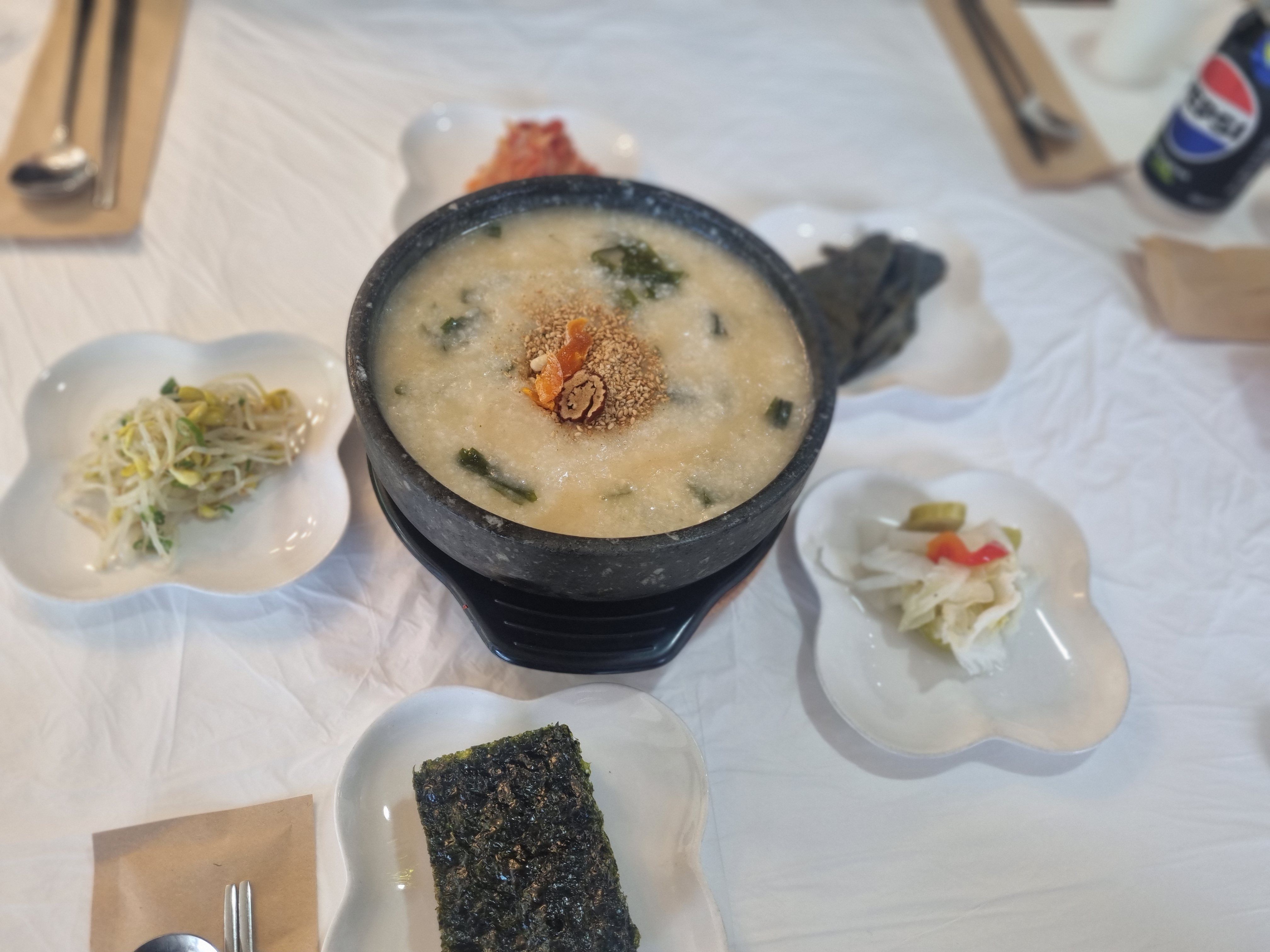이번에 제가 먹은 건 바로 가자미 어죽이였는데요. 그냥 죽만 나오는 게 아니라, 따끈한 돌솥에 끓여낸 어죽 위에 고명까지 정성스럽게 올라가 있고, 다양한 밑반찬이 함께 나와서 혼자 먹기엔 정말 푸짐했어요. 은은하게 퍼지는 참기름 향에 고소한 맛이 정말 진국이에요.