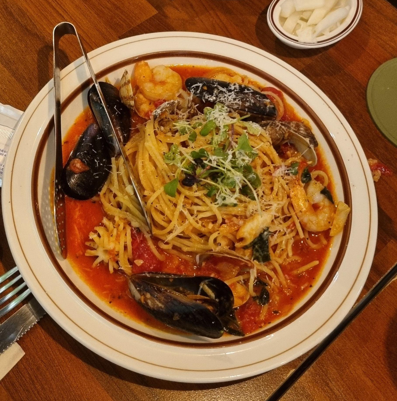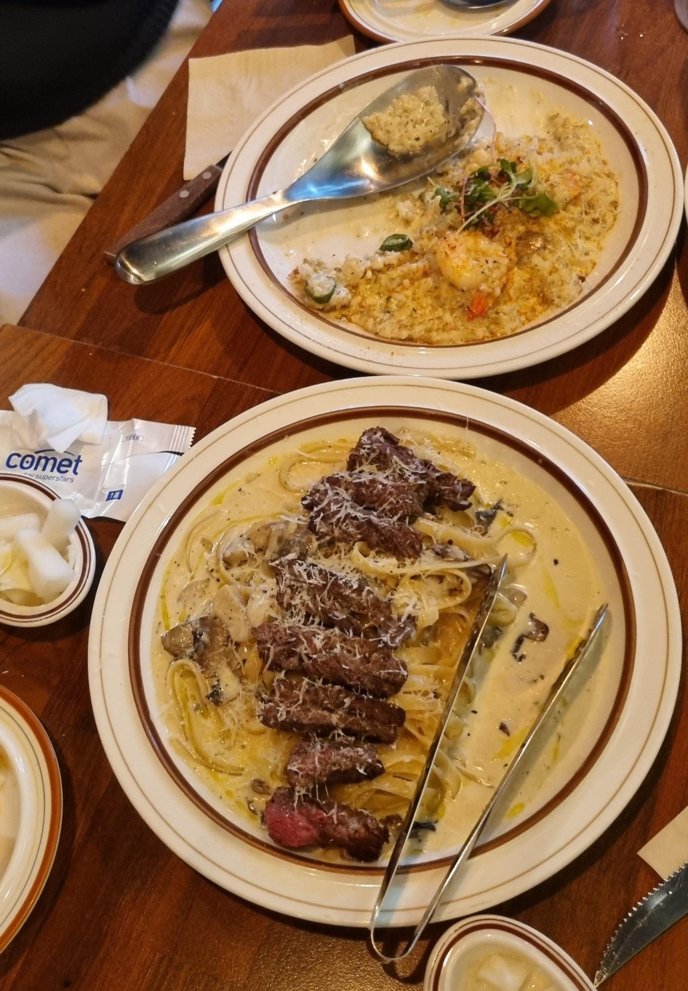 루꼴라 피자는 얇고 바삭한 도우 위에 신선한 루꼴라, 생햄, 방울토마토가 올라가 상큼하고 산뜻한 맛을 냅니다. 치즈가 과하지 않아 끝까지 부담 없이 즐길 수 있었어요. 새우크림 리조또는 탱글한 새우가 듬뿍 들어가 씹는 재미가 있고, 부드러운 크림 소스가 고슬한 밥알을 감싸며 고급스러운 풍미를 자랑했어요. 여기에 뽀모도로 리조또를 함께 곁들이면 크림의 부드러움과 토마토의 산뜻함이 번갈아 입안을 리프레시해줘서 궁합이 딱이에요.