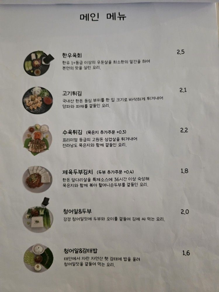 저희가 주문한 건 수육튀김, 김치말이국수, 그리고 얼큰해물순두부찌개였어요. 사실 다른 테이블 보니까 고기튀김이나 한우육회도 많이들 주문하시더라고요. 다음에 꼭 먹어보리라 다짐하면서, 일단 우리가 고른 메뉴부터 하나씩 소개해볼게요.