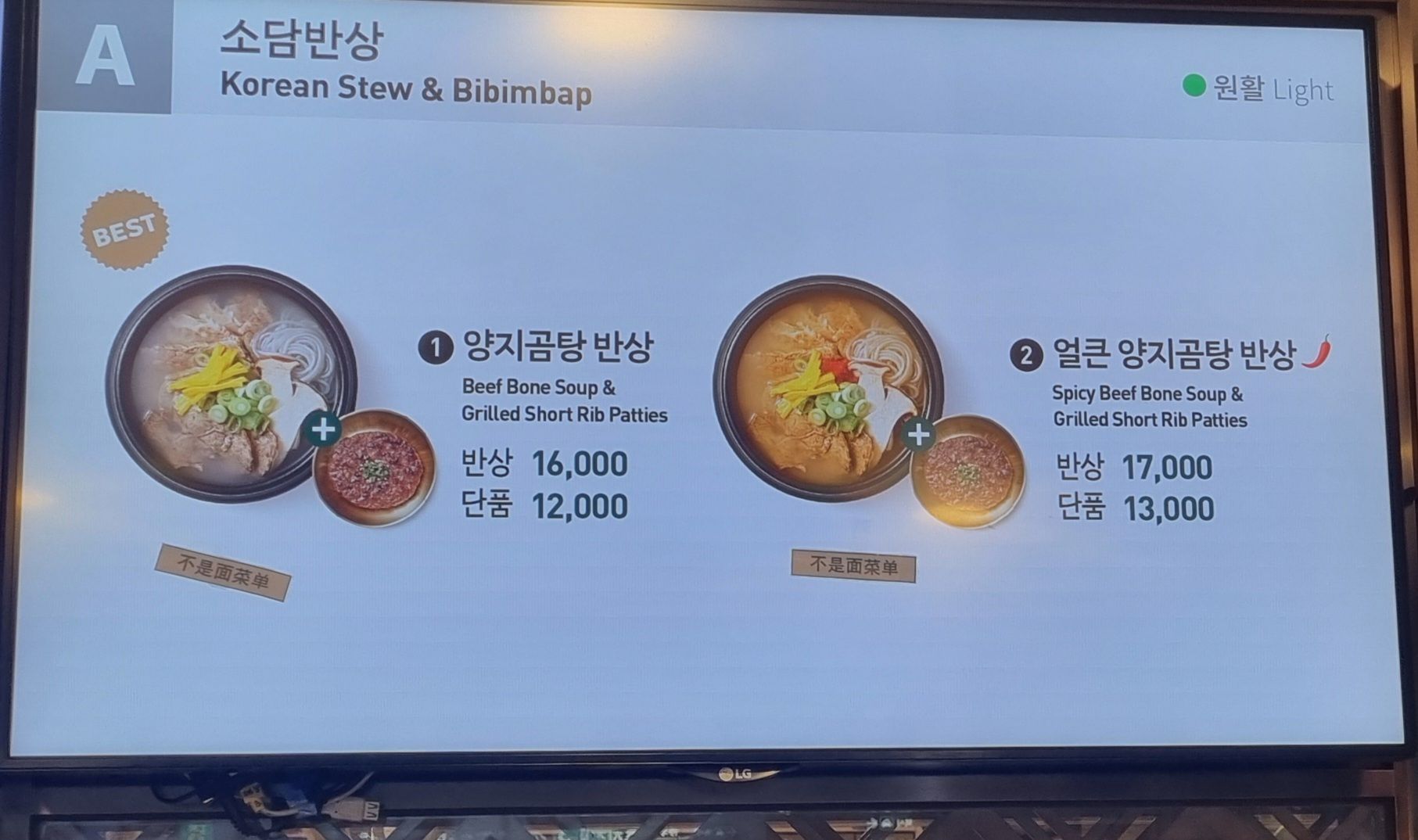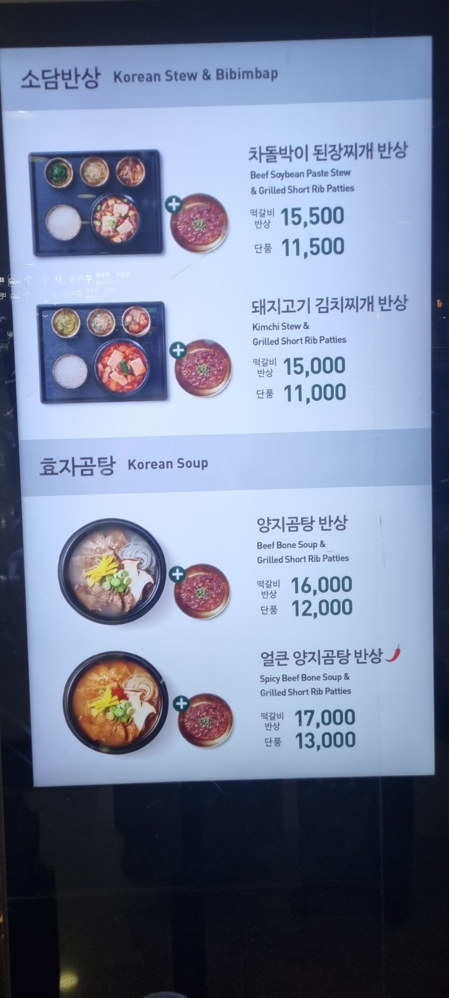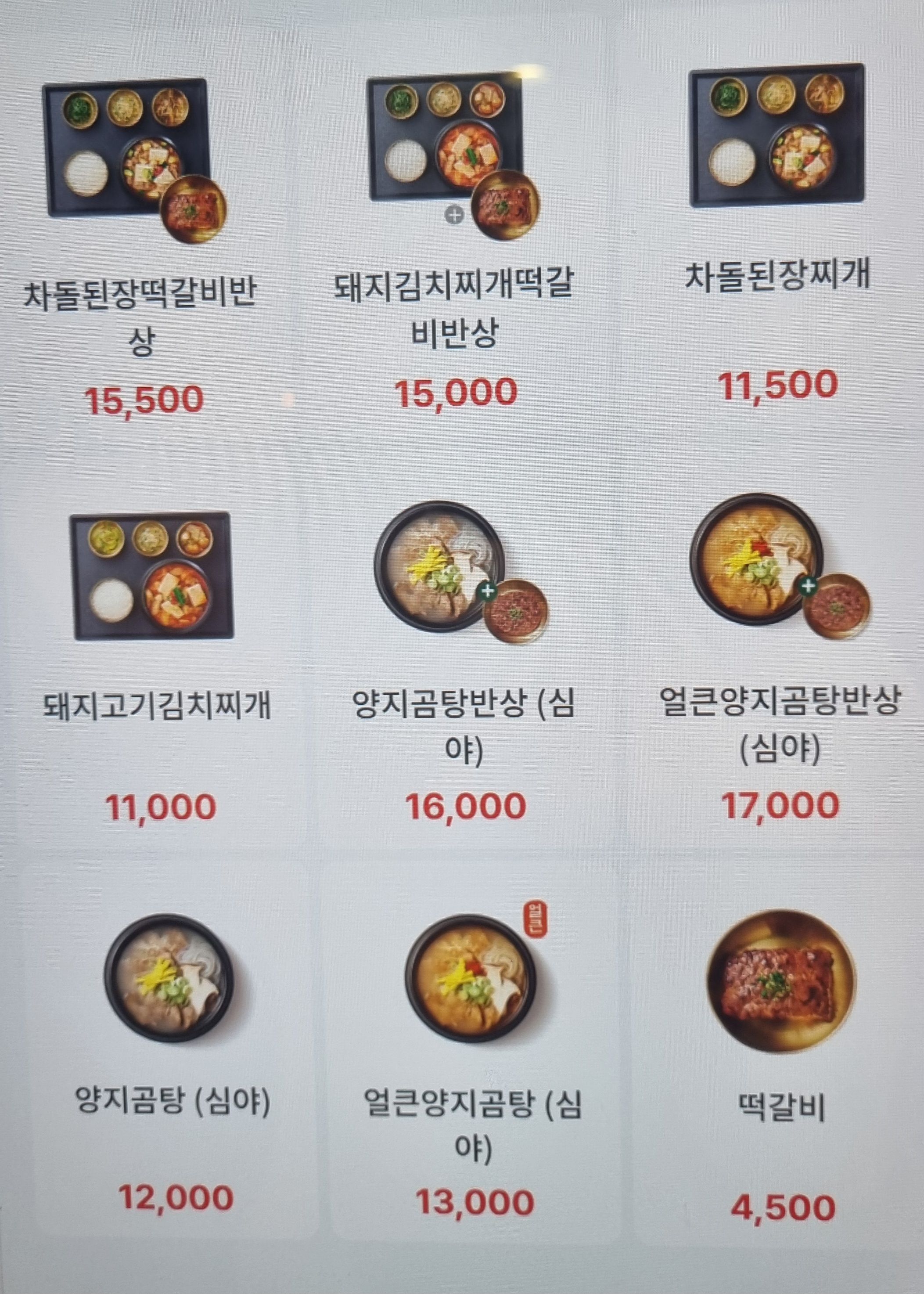 - 주요메뉴 : 차돌된장찌개, 돼지김치찌개, 양지곰탕, 얼큰양지곰탕, 떡갈비 반상
