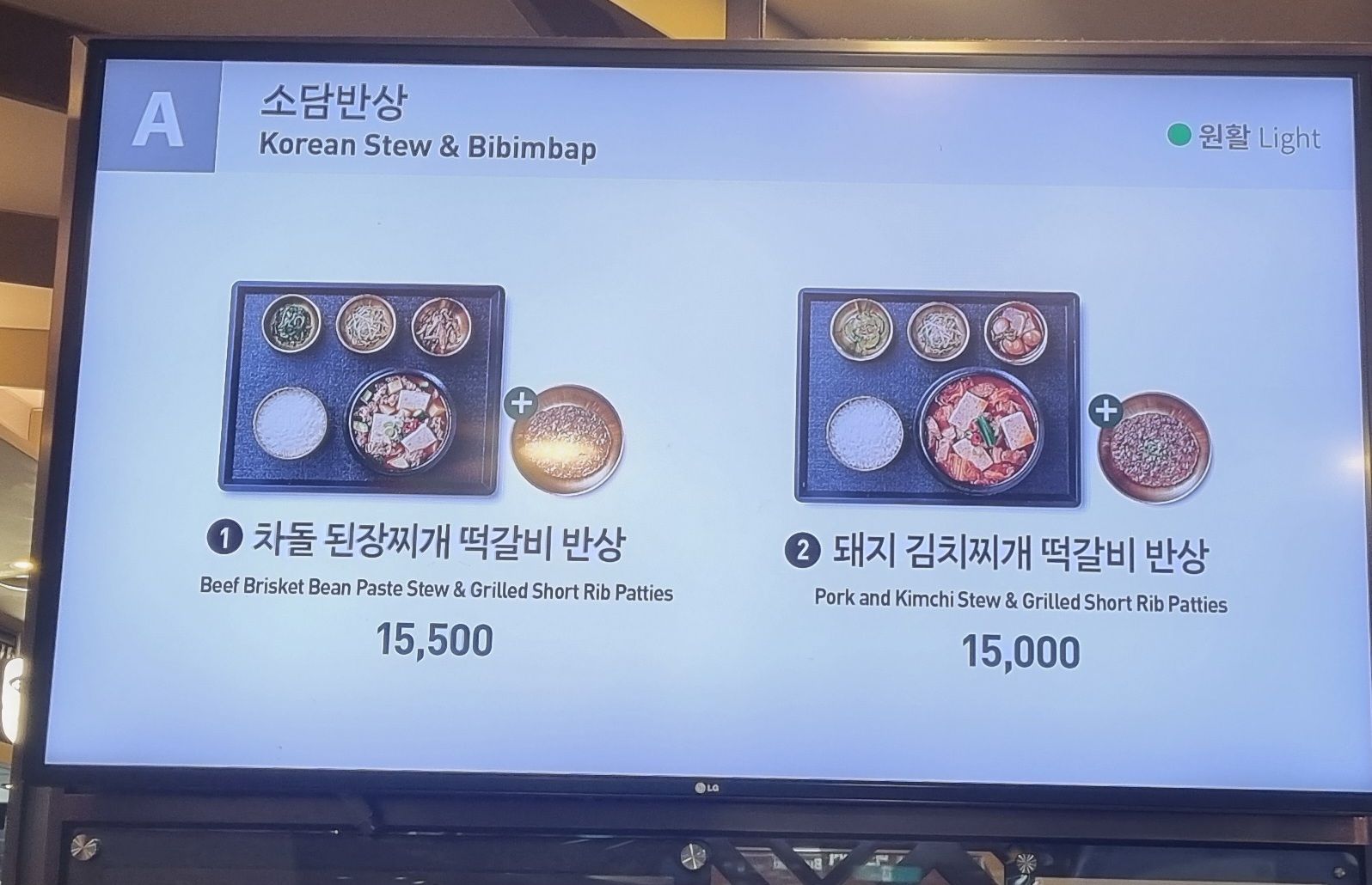문 앞에는 키오스크와 메뉴 사진이 크게 걸려 있어서, 한눈에 오늘 뭐 먹을지 정할 수 있었습니다.