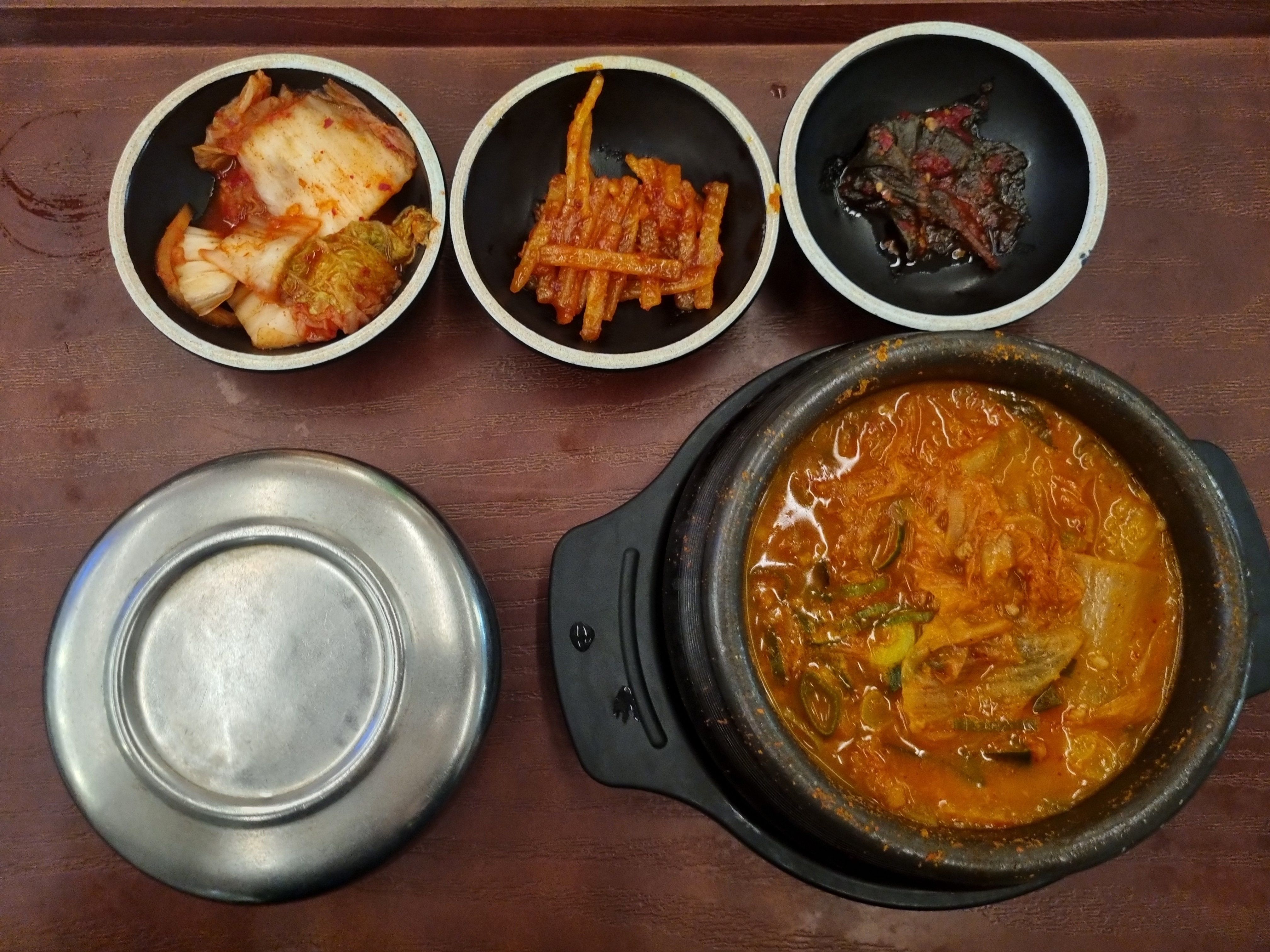 받자마자 보글보글 끓는 소리가 들리고, 김치의 새콤 칼칼한 향이 확 올라옵니다.