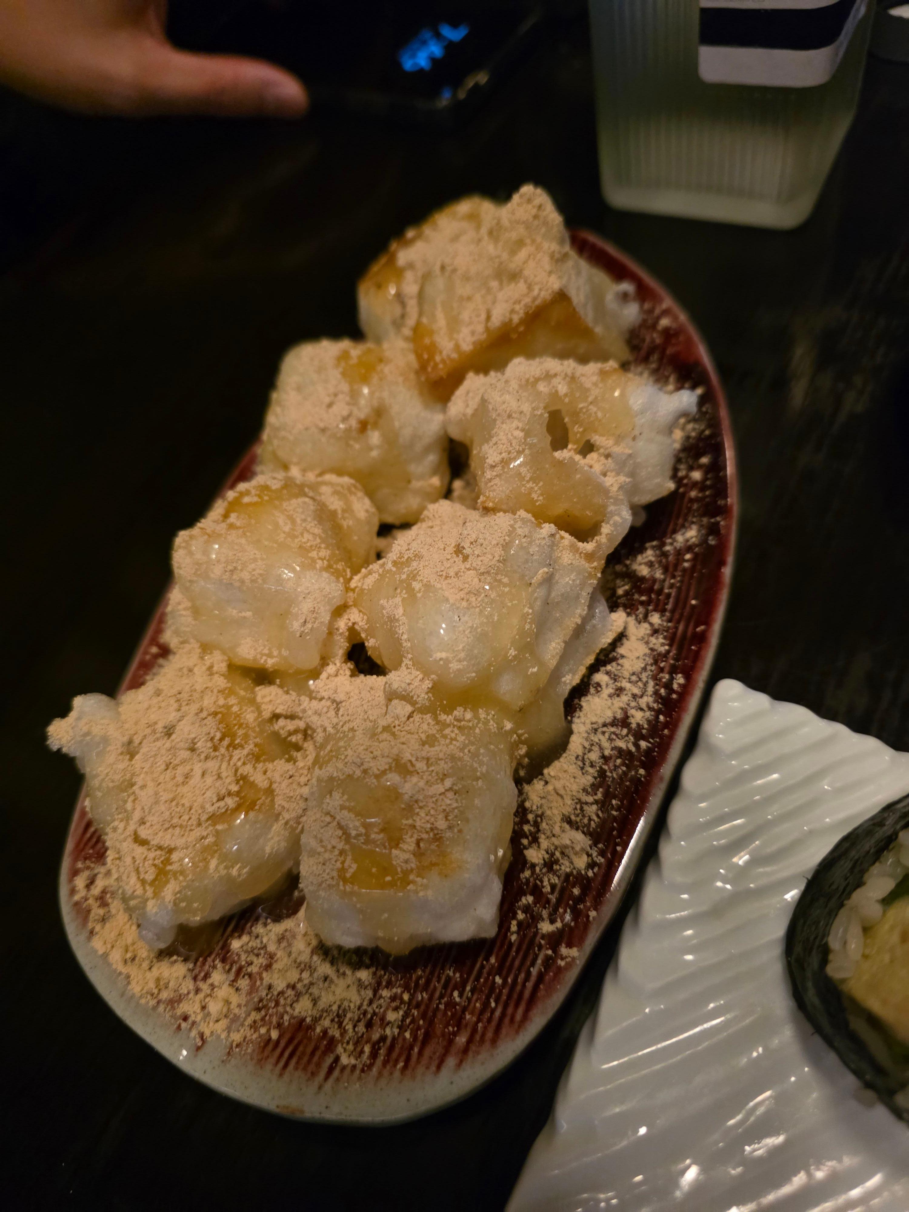 음식은 하나씩 코스로 나왔는데, 스타터로 나온 계란찜은 너무부드러워서 입안에서 녹았고 안주로도 좋고 입맛 돋우기에도 딱이었어요. 뒤이어 나온 가지 구이는 살짝 간장 소스로 조려져 감칠맛이 강했고, 가쓰오부시가 솔솔 뿌려져 있어 풍미가 한층 깊었어요.