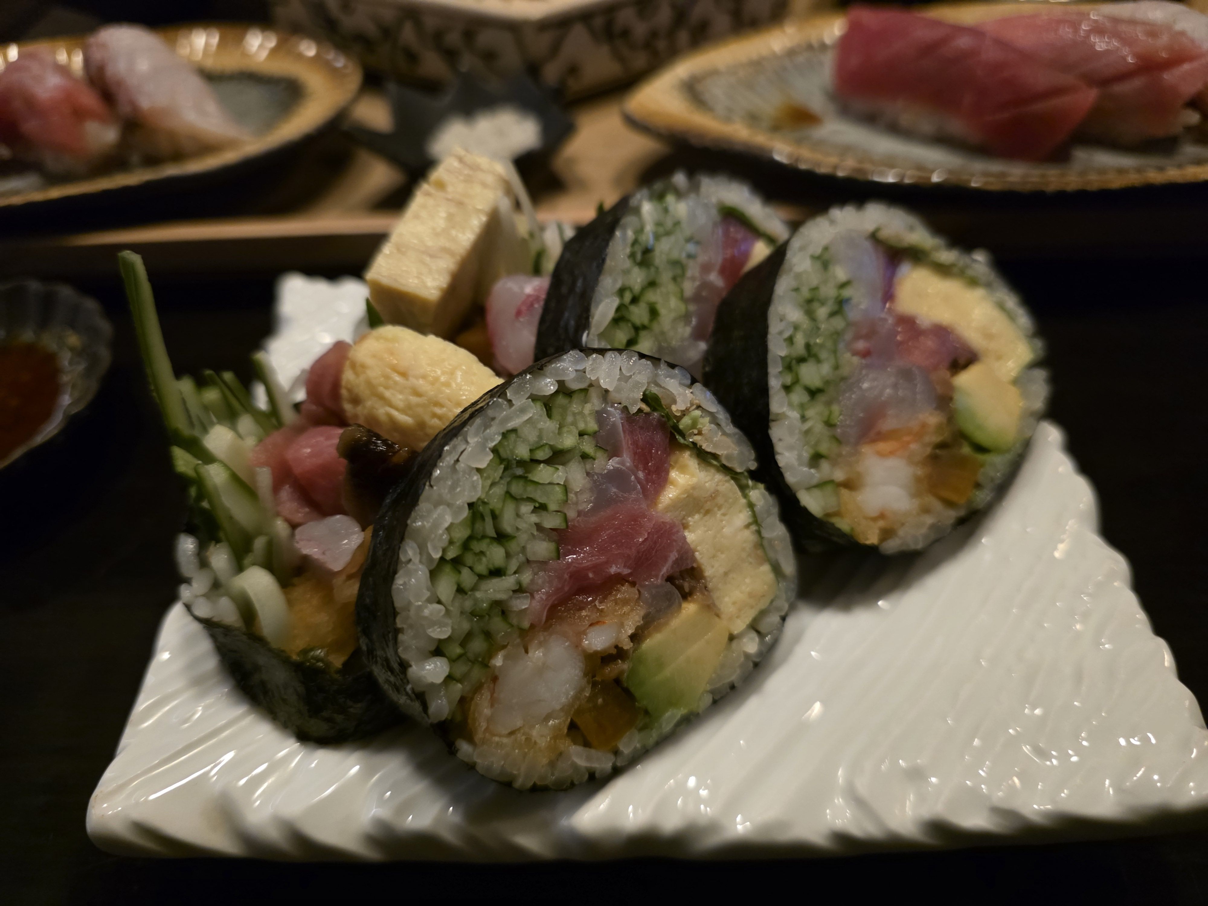 사카바산원의 시그니처 중 하나인 후토마키는 속이 정말 알찼어요. 달걀, 오이, 아보카도, 생선살이 가득 차 있고 식감이 살아있어서 한 입 베어 물면 여러 맛이 조화롭게 느껴졌어요. 후토마키는 사진 찍기에도 예쁘고 한 조각만 먹어도 포만감이 와서 술안주로 좋았어요.