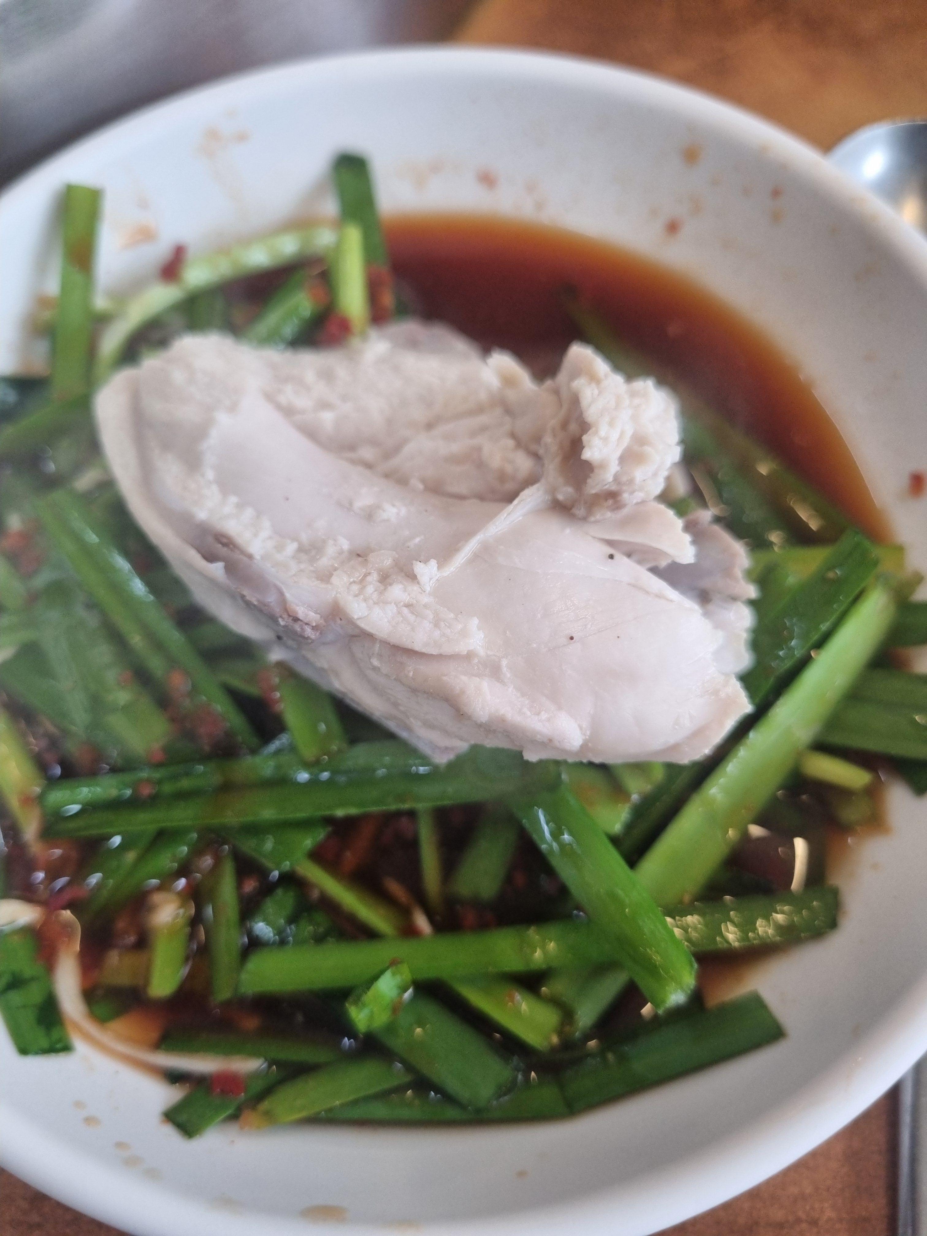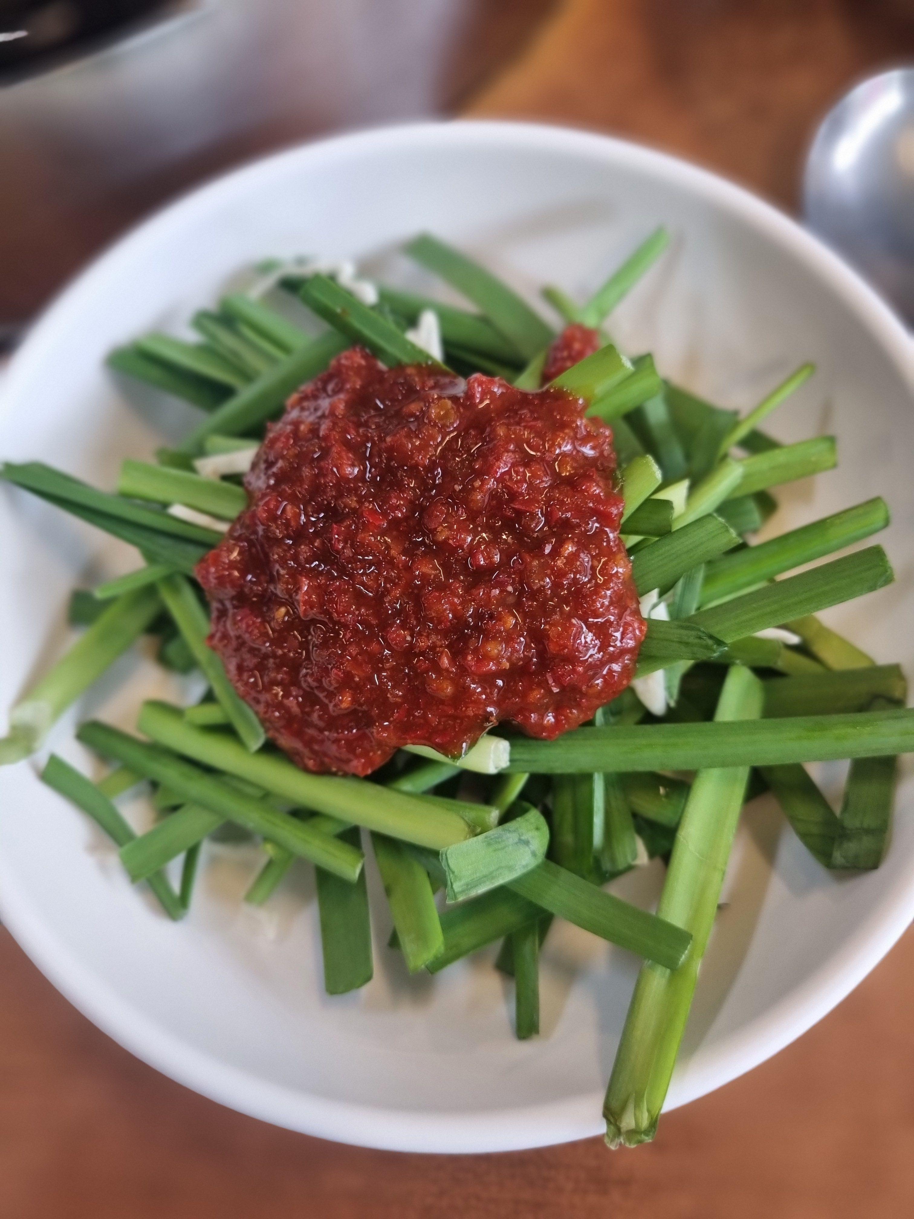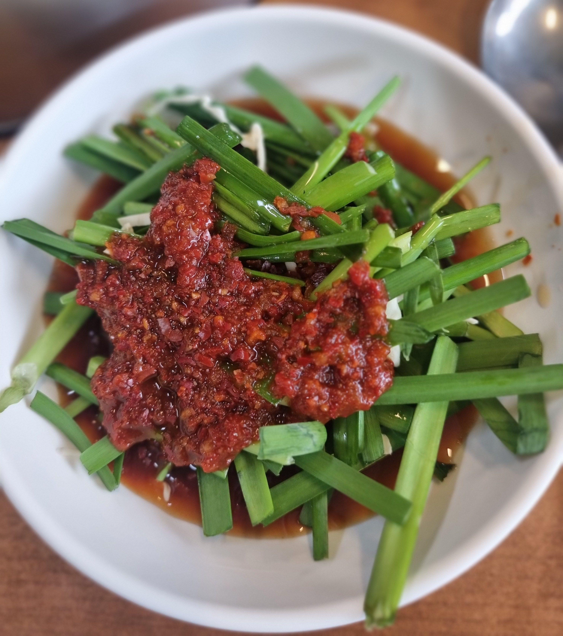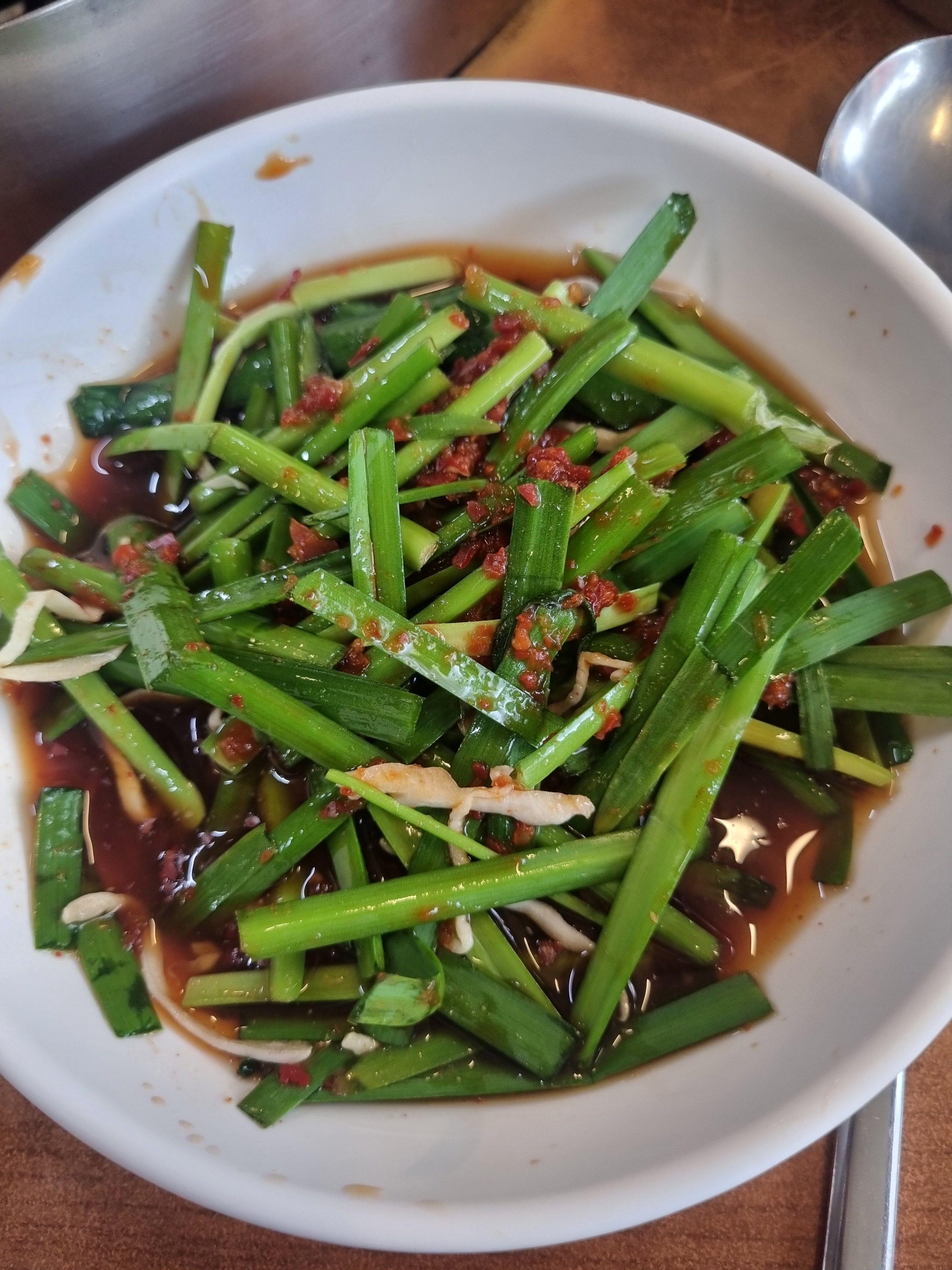 이 부추무침도 별미인데, 아삭아삭한 부추에 고추다대기랑 간장 소스가 섞여