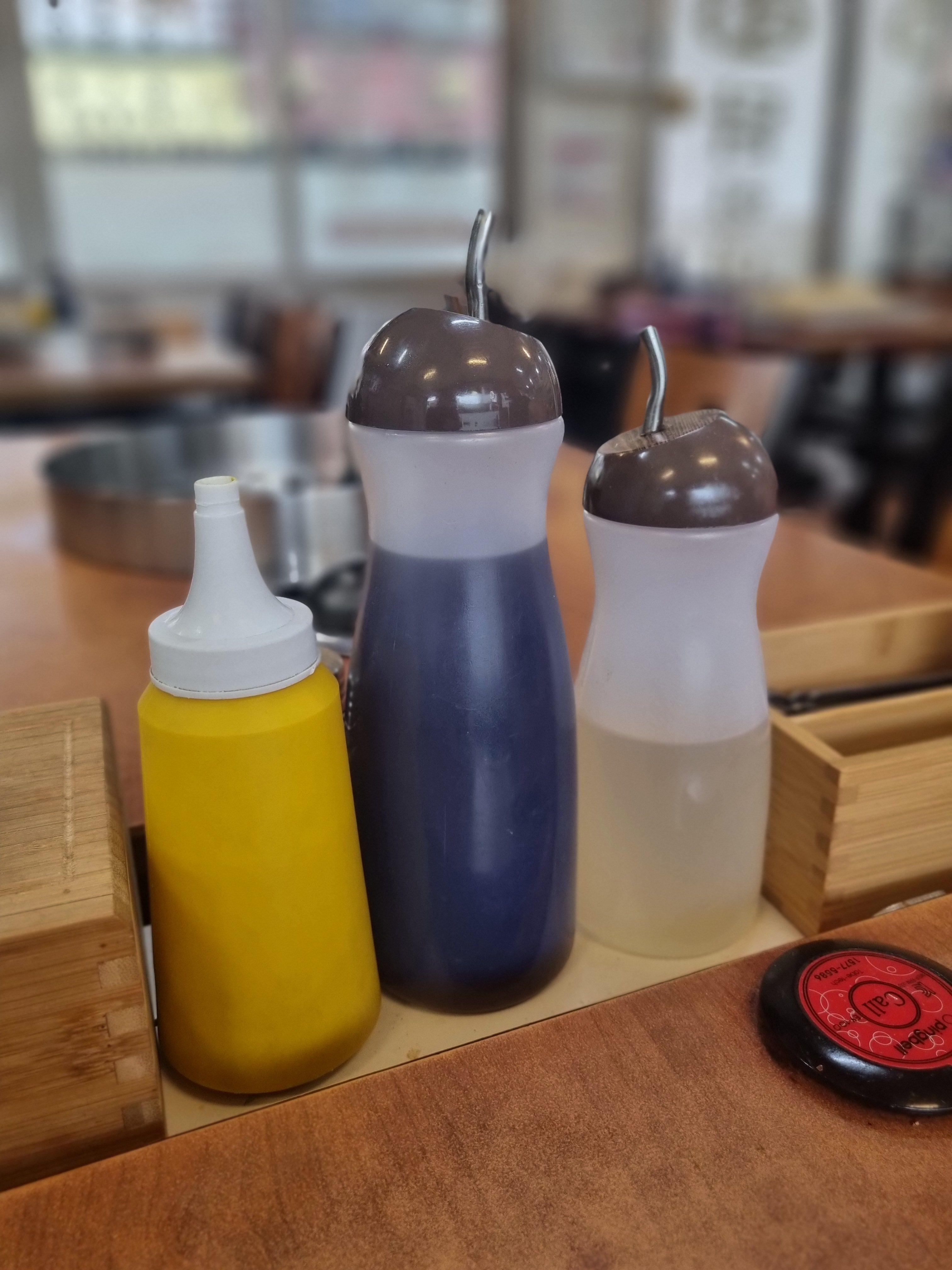 자리에 앉으면 노란색, 갈색, 투명 소스병이 보이는데