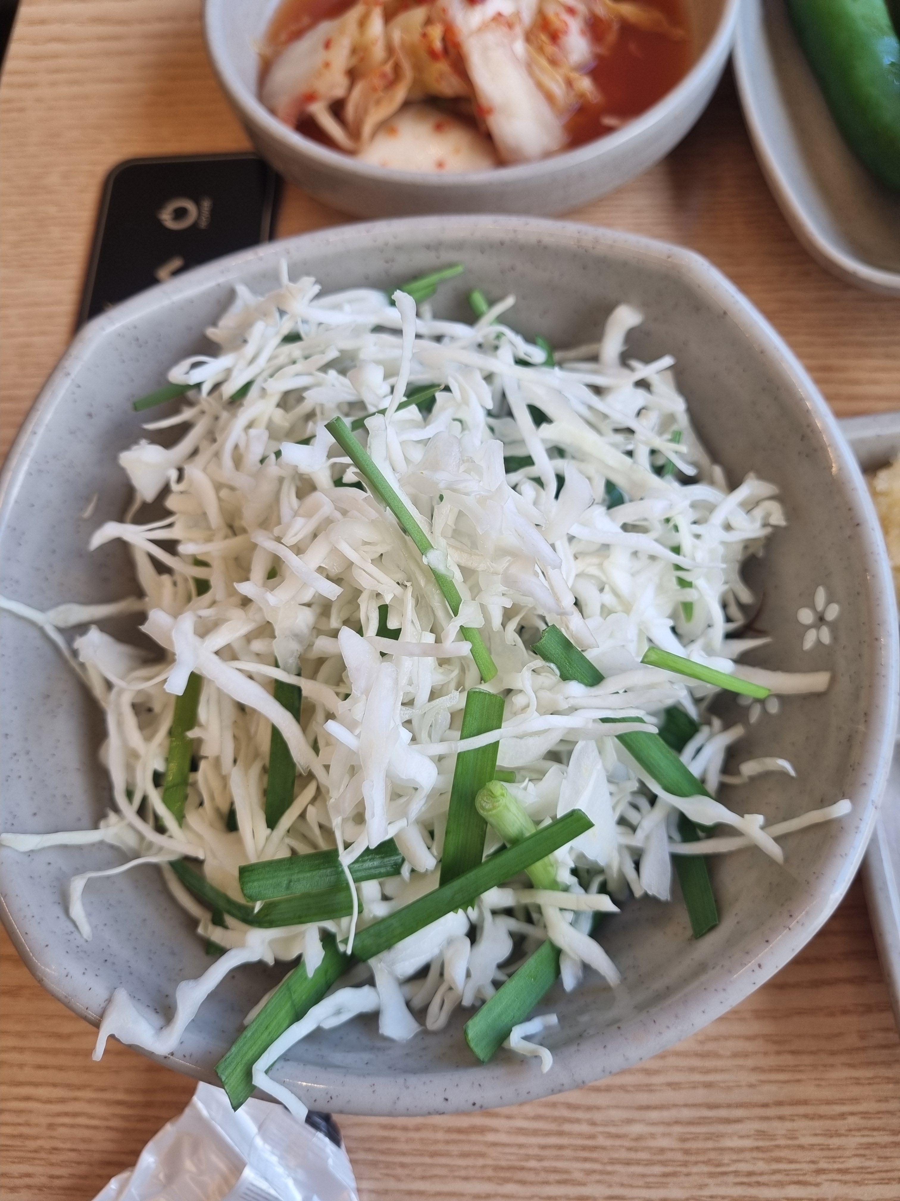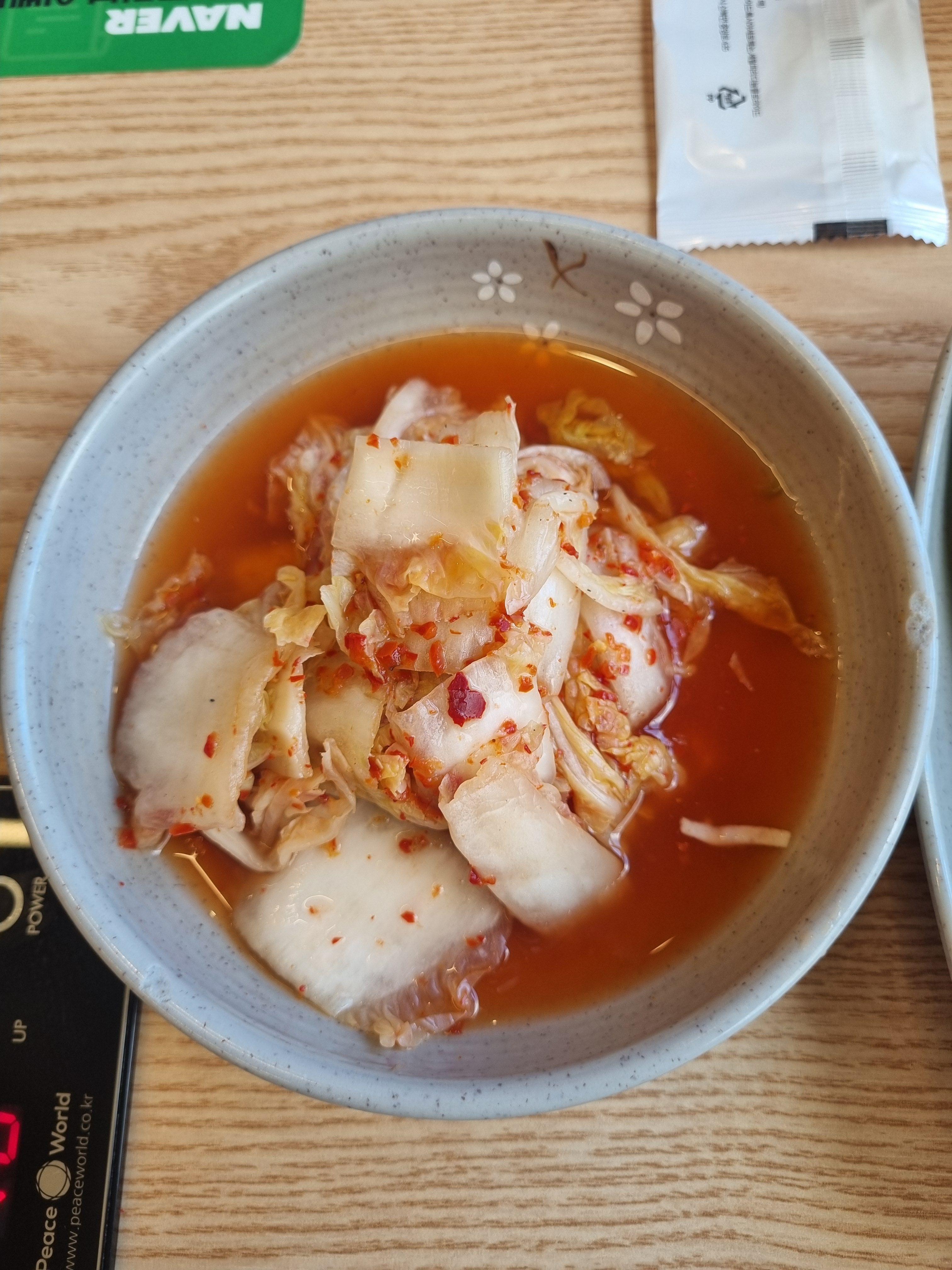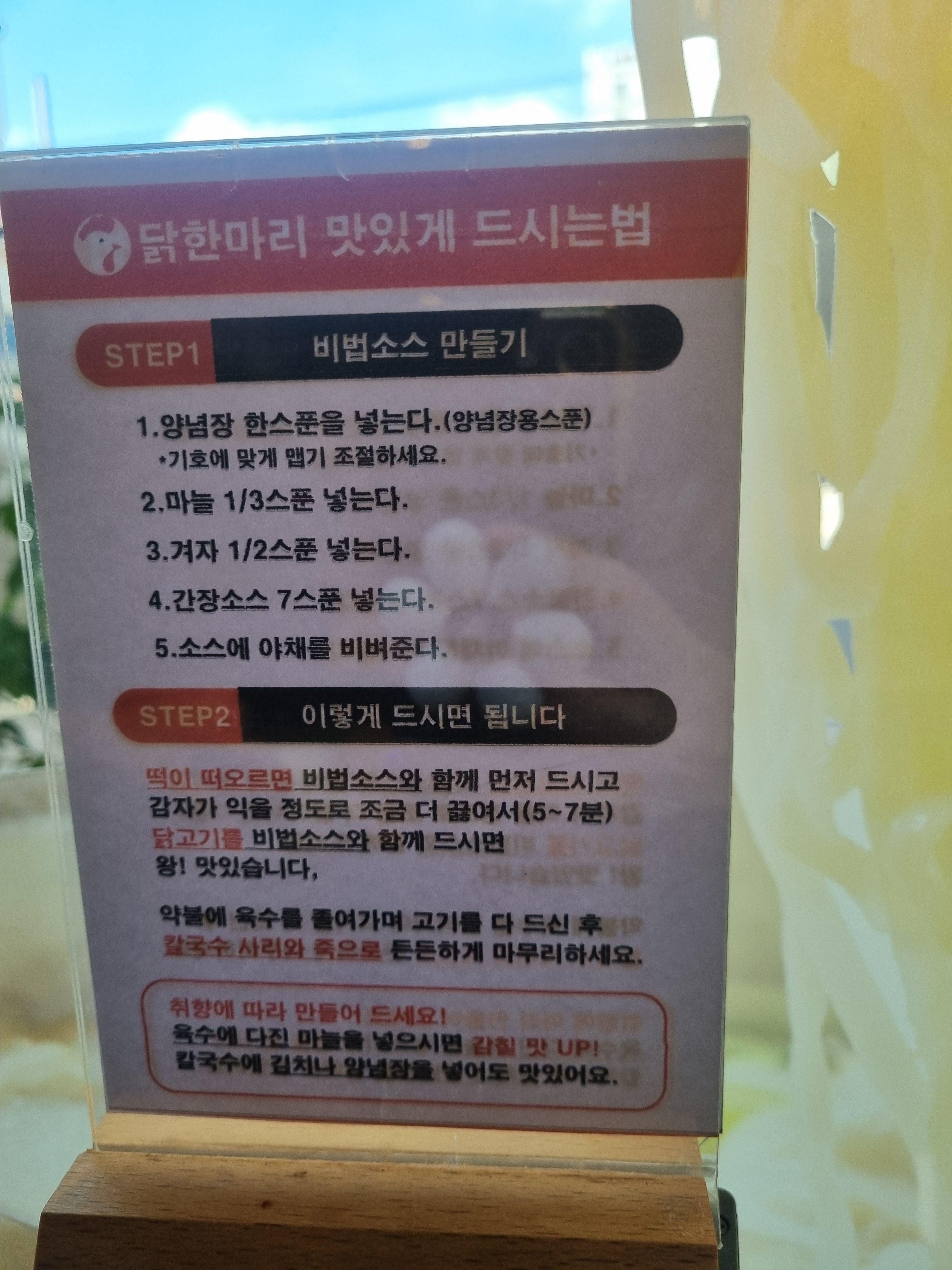 그래도 양배추와 함께 비벼 먹으니 매운맛이 어느 정도 중화되면서 아삭한 식감까지 더해져 훨씬 맛있게 즐길 수 있었습니다. 특히 닭고기를 소스에 푹 찍어 한입 베어물었을 때, 맑은 국물에 우러난 닭의 고소함과 매콤한 소스가 만나 정말 별미였어요.