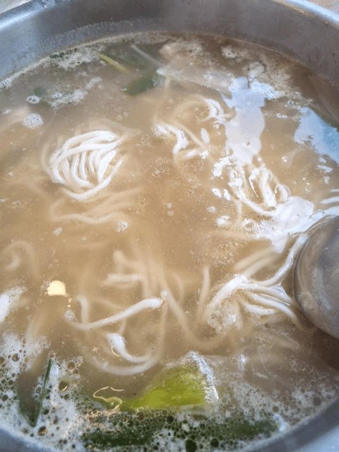 고기를 어느 정도 먹고 난 뒤, 기다리고 기다리던 칼국수 사리를 두 개나 넣었습니다. 이미 진해진 닭육수에 칼국수를 넣고 팔팔 끓여내니 정말 별미였어요.