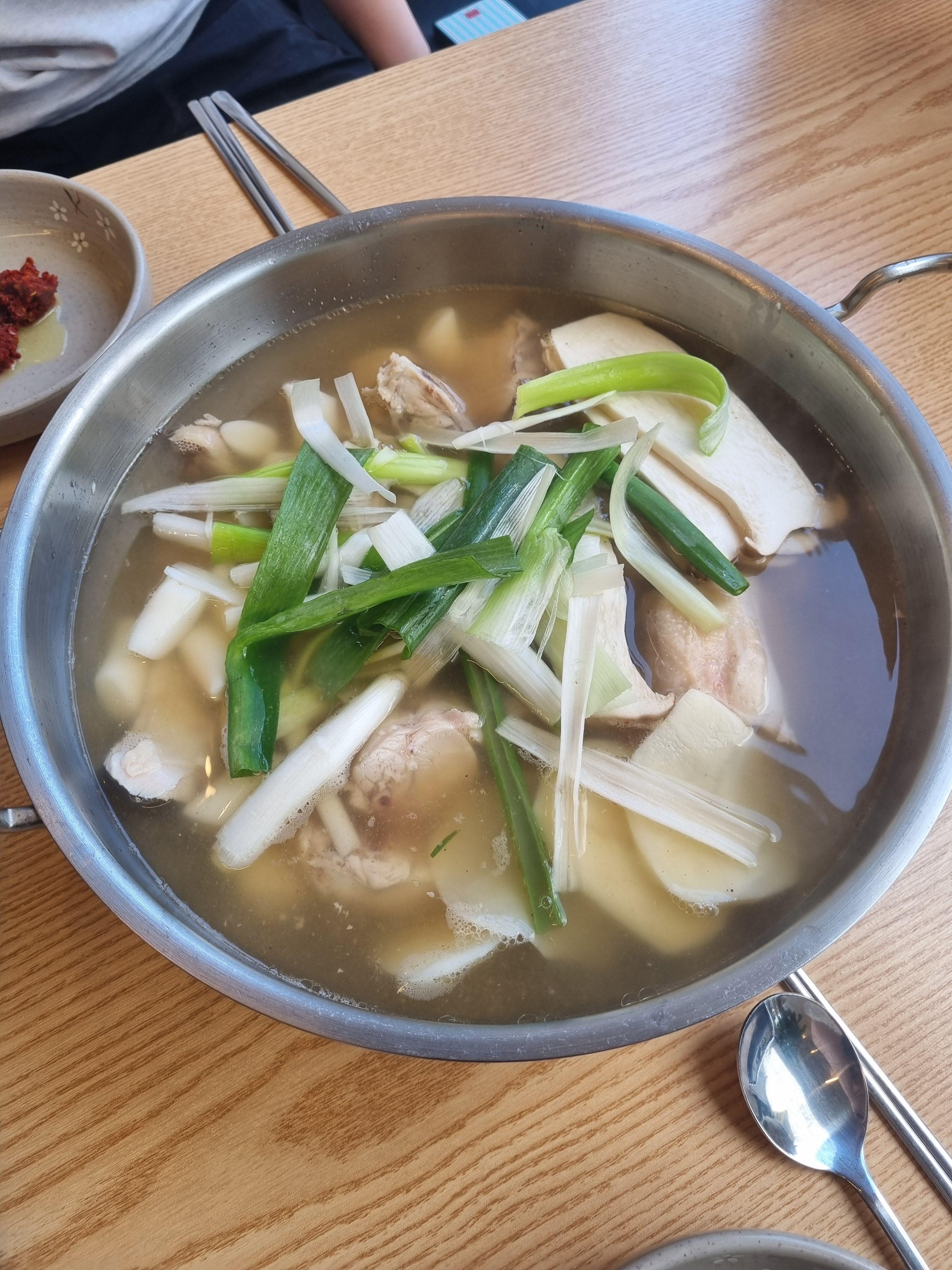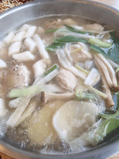 잠시 기다리니 테이블 가운데 큰 냄비에 담긴 닭한마리가 등장했습니다. 푸짐하게 썬 파와 감자, 떡, 그리고 큼직한 닭 조각들이 국물에 담겨 있었어요. 첫인상은 아주 깔끔하고 ‘국물이 개운하겠다’는 생각이 바로 들었습니다.