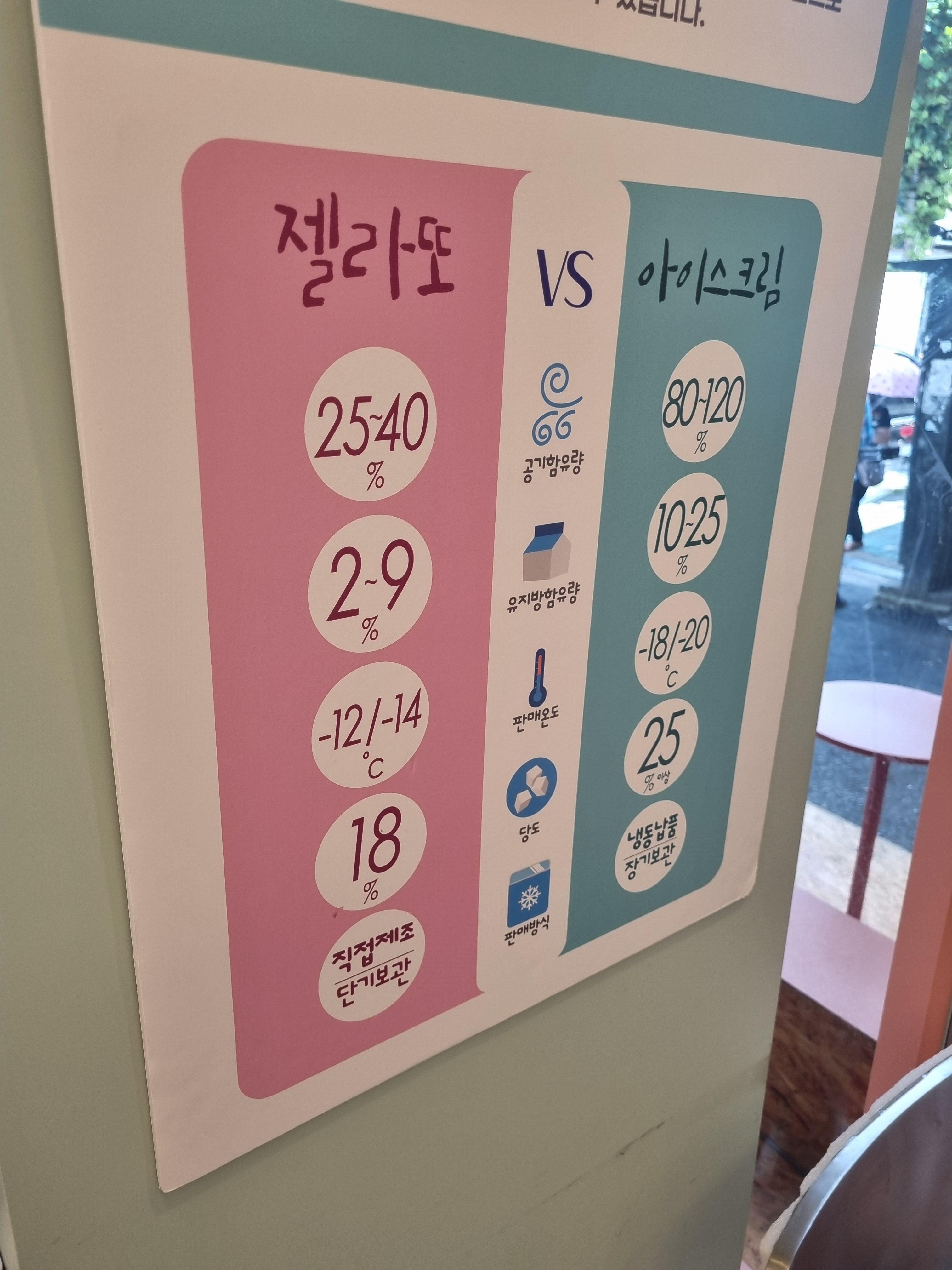 가게 안쪽에는 젤라또와 아이스크림의 차이를 설명해 둔 안내판이 있었는데, 단순히 맛만 다른 게 아니라 과학적인 차이가 있더라고요. 항상 직접 제조, 단기 보관을 원칙으로 한다고 적혀 있었죠.