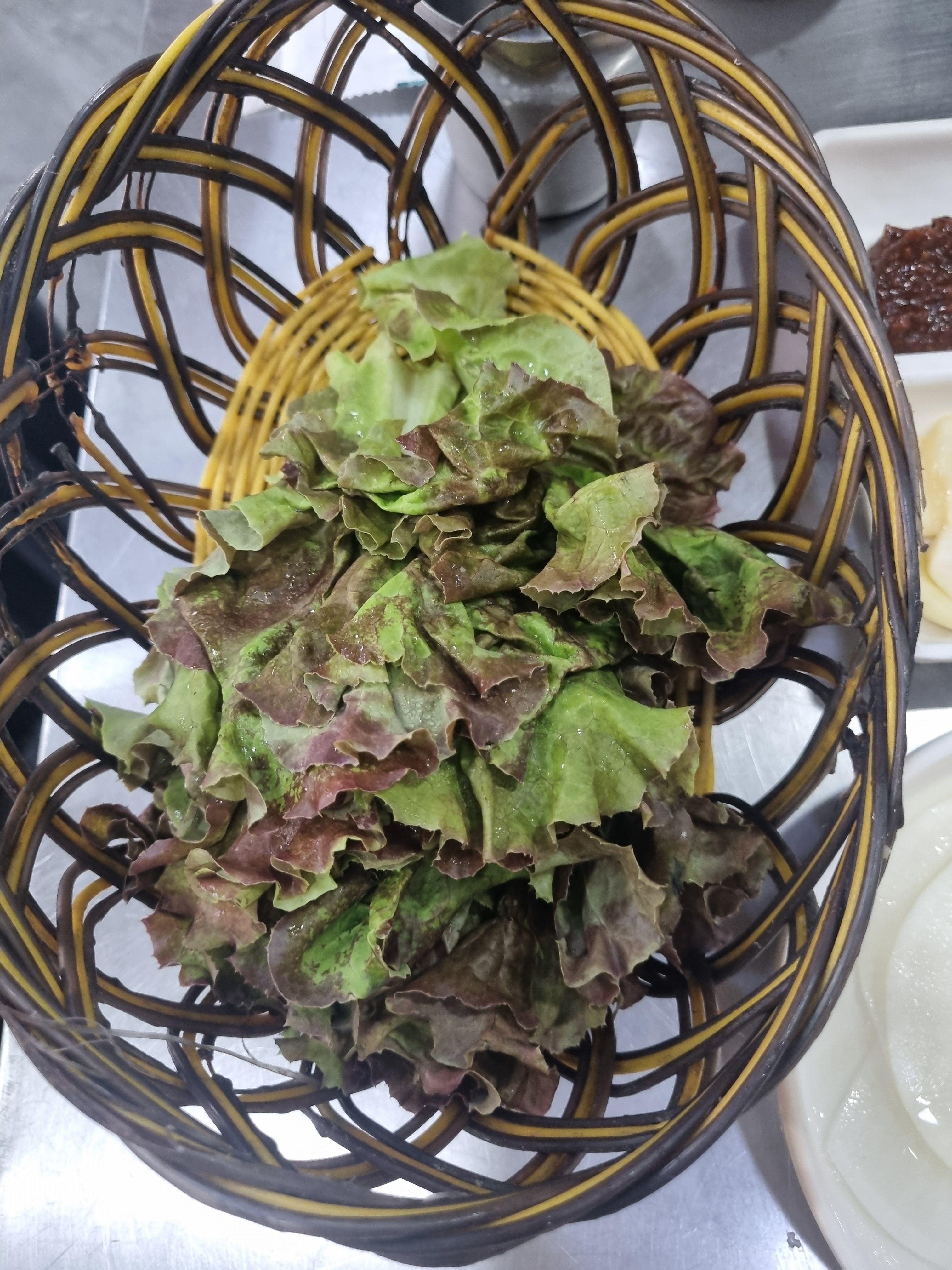 자리에 앉자마자 세팅된 반찬들을 하나씩 살펴봤습니다. 먼저 상추 바구니가 큼직하게 준비돼 있었는데, 잎이 싱싱하고 윤기가 돌아서 손이 절로 가더군요. 그 옆에는 무쌈이 담긴 작은 접시, 그리고 양파절임이 한 그릇. 양파절임은 간장 베이스에 새콤하면서도 은은한 단맛이 돌았는데, 고기와 함께 먹을 때 확실히 느끼함을 잡아주겠구나 싶었어요.