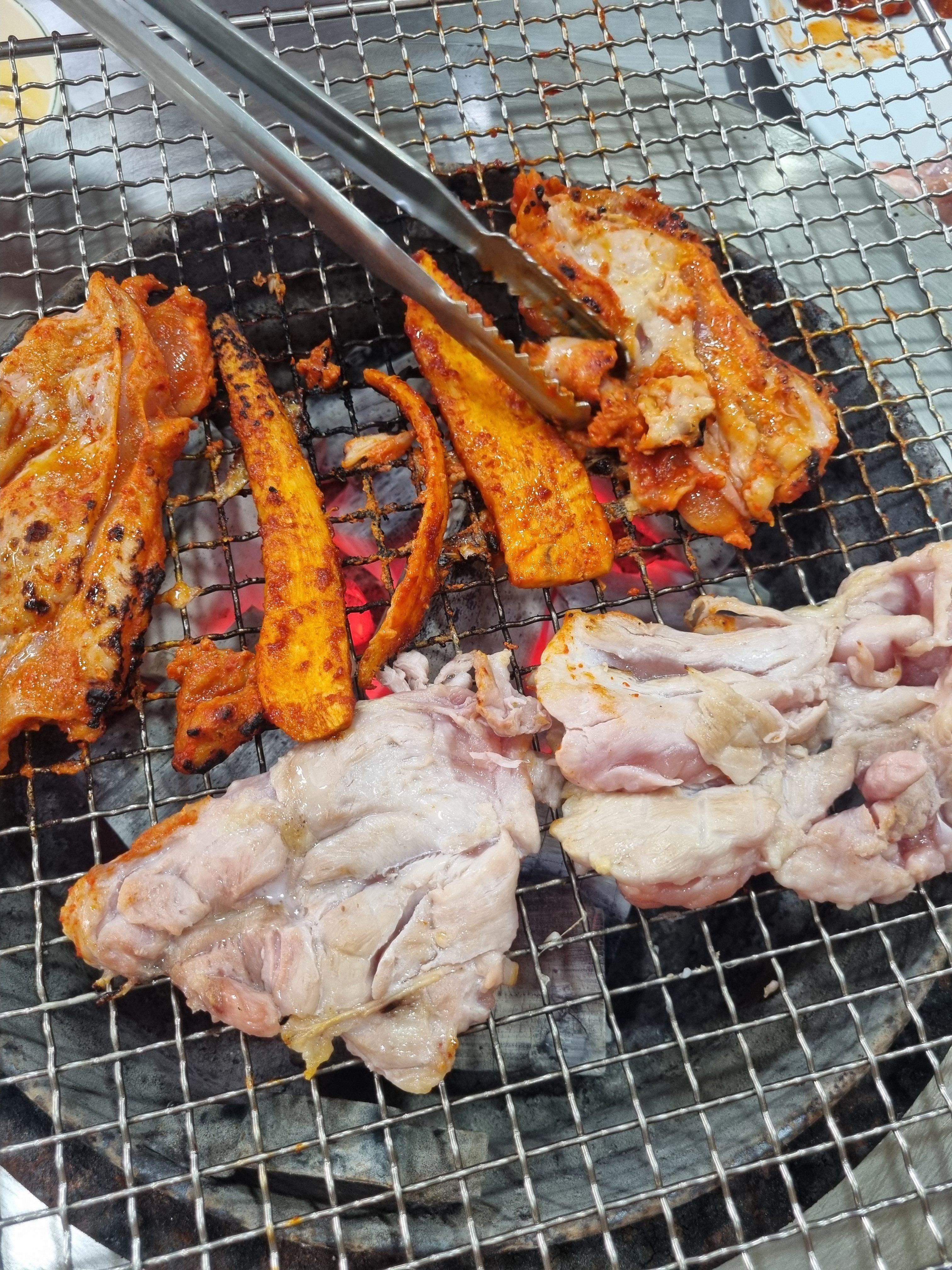 다음으로 구워진 건 빨갛게 양념이 배어 있는 양념 닭갈비였어요. 불판 위에서 익어가며 피어오르는 매콤달콤한 향이 코끝을 자극하니 벌써부터 군침이 돌았습니다.