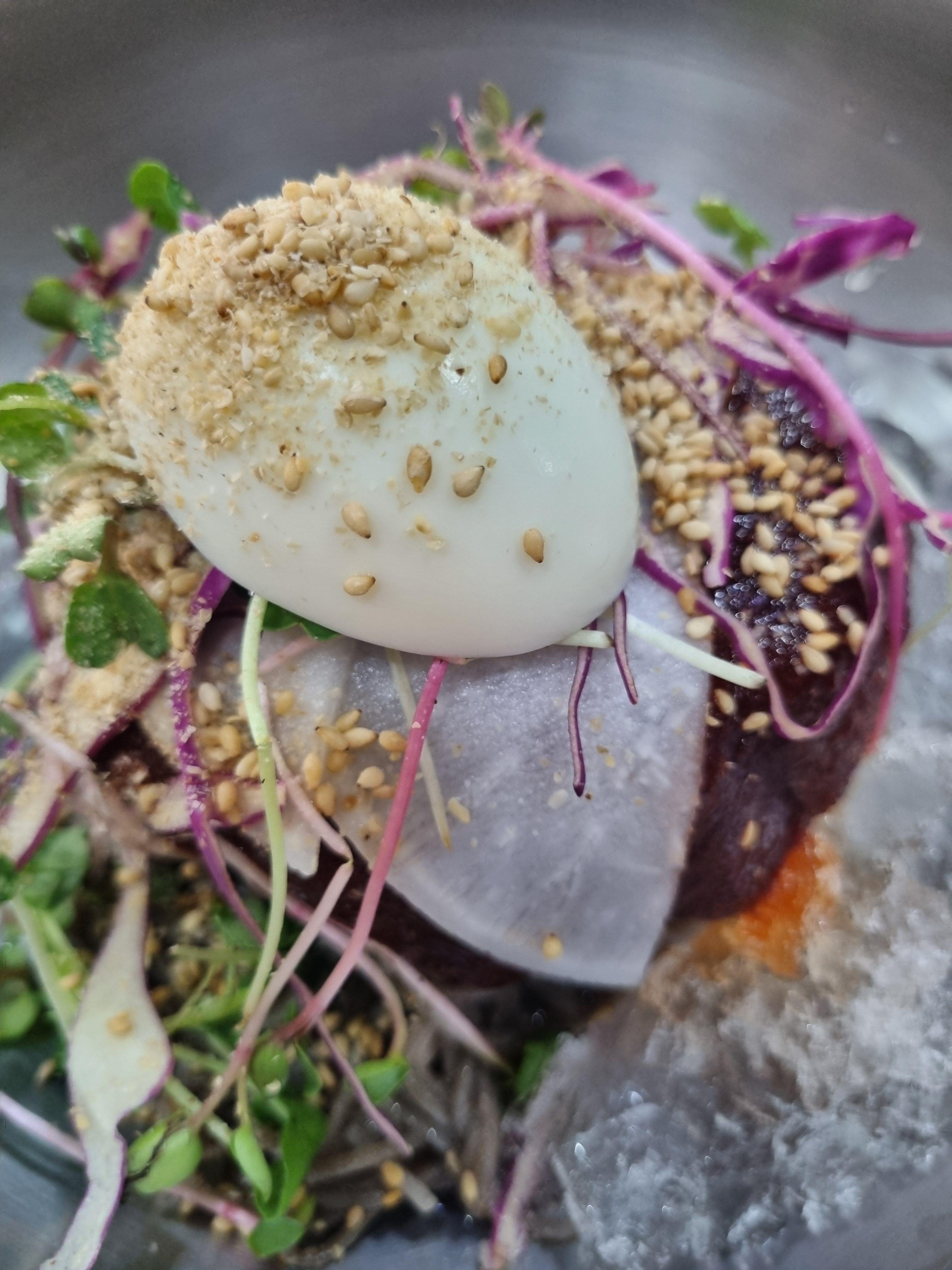 비주얼은 근사했는데, 첫 입에는 다소 싱겁다는 느낌이 들었어요. 하지만 설탕과 식초를 살짝 넣으니 금세 맛이 살아나더군요. 새콤달콤하면서도 메밀 특유의 구수함이 어우러져 고기를 먹은 뒤 입안을 정리하기에 딱 좋았습니다.