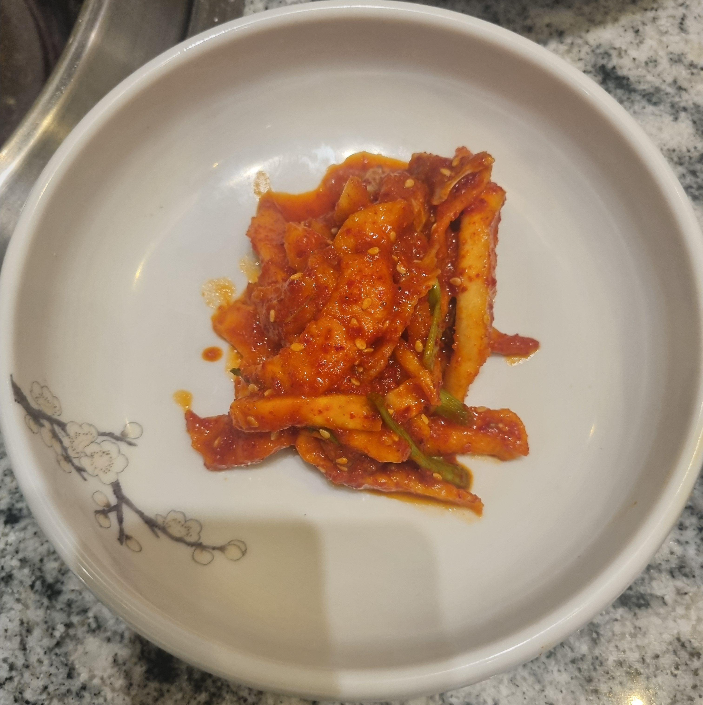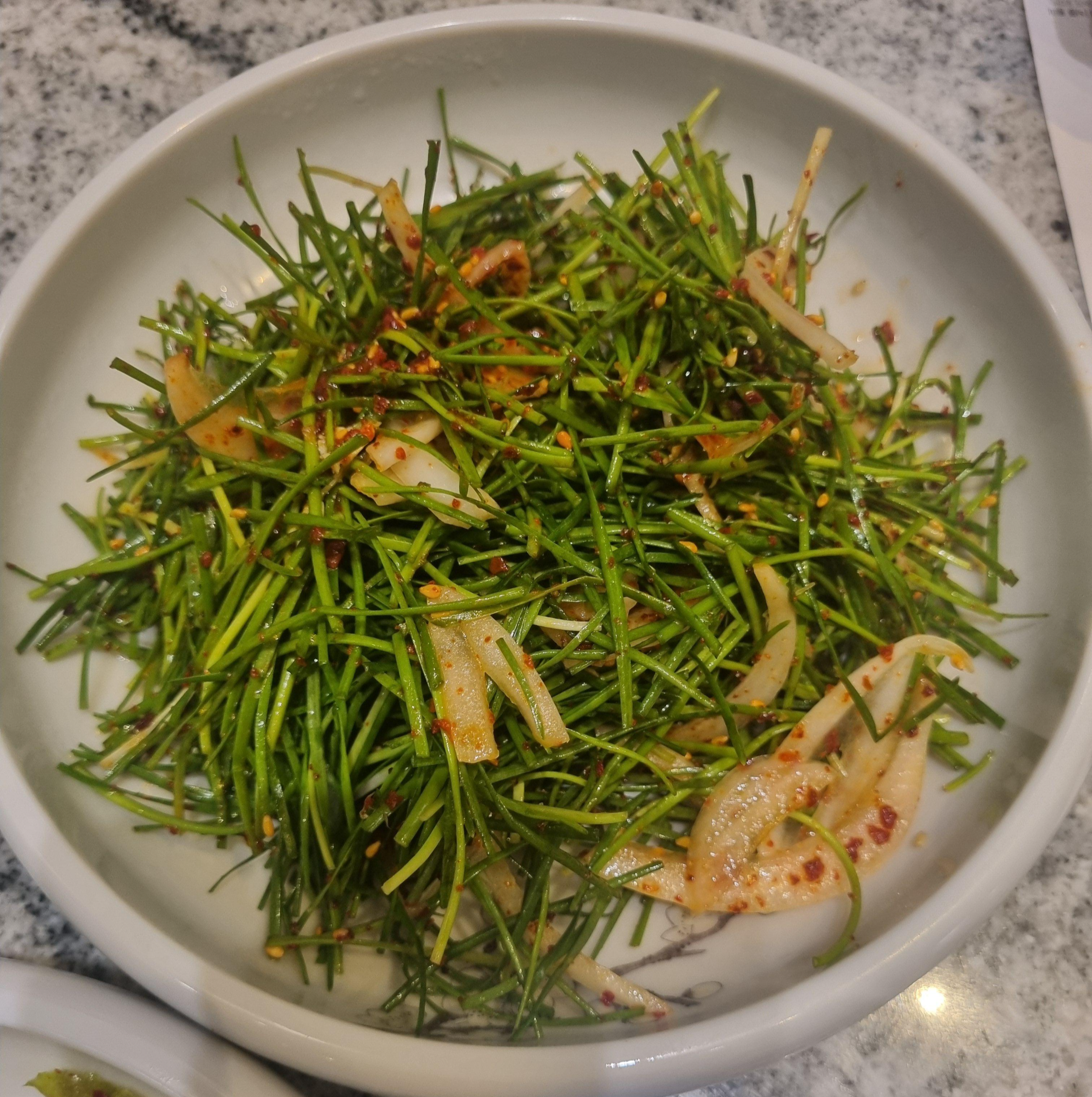 기본 반찬들도 정갈해요. 파무침은 매콤하게 무쳐져서 고기와 함께 먹기 좋았고, 잡채는 기름기 적고 담백해서 사이드로 만족도 높았어요.