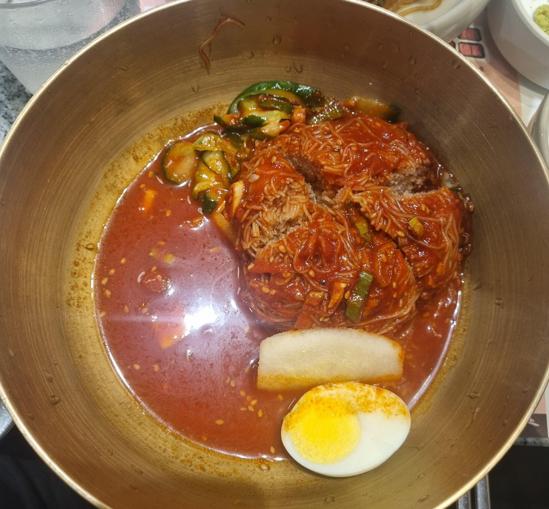 마지막은 냉면으로 마무리. 저는 비빔냉면, 일행은 물냉면을 주문했어요. 비빔냉면은 매콤달콤 양념이 숟가락이 멈추지 않는 맛이고, 물냉면은 국물이 깔끔하고 시원해서 고기 먹고 난 뒤에 입안을 정리하기 좋았어요.