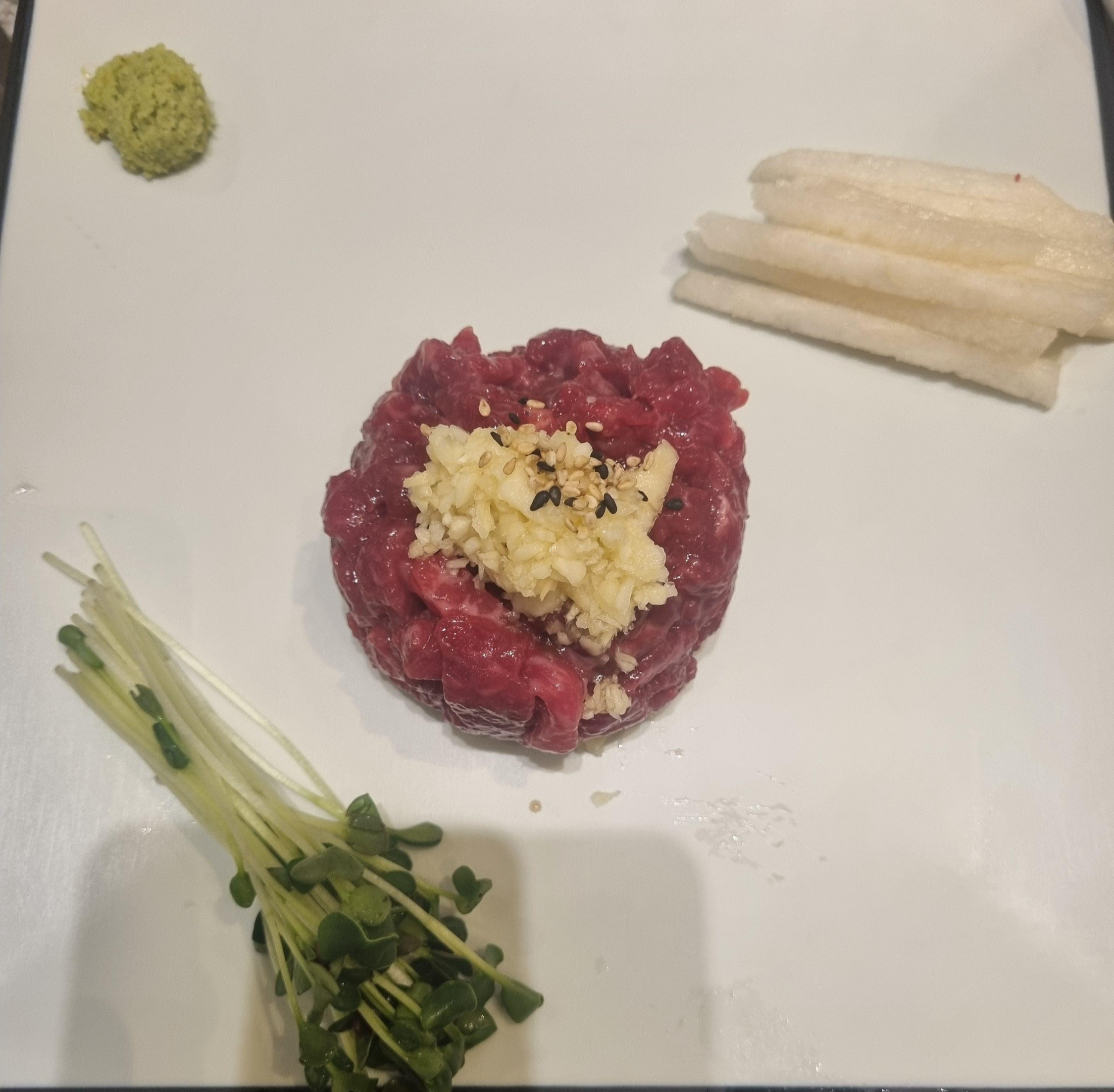 육회는 신선한 한우를 사용해서 그런지 잡내가 전혀 없고 깔끔했어요. 배, 사과를 송송 썰어 올려서 달콤하고, 참기름과 깨가 고소함을 더해줘요. 와사비 살짝 곁들이면 매콤한 풍미가 확 살아납니다.