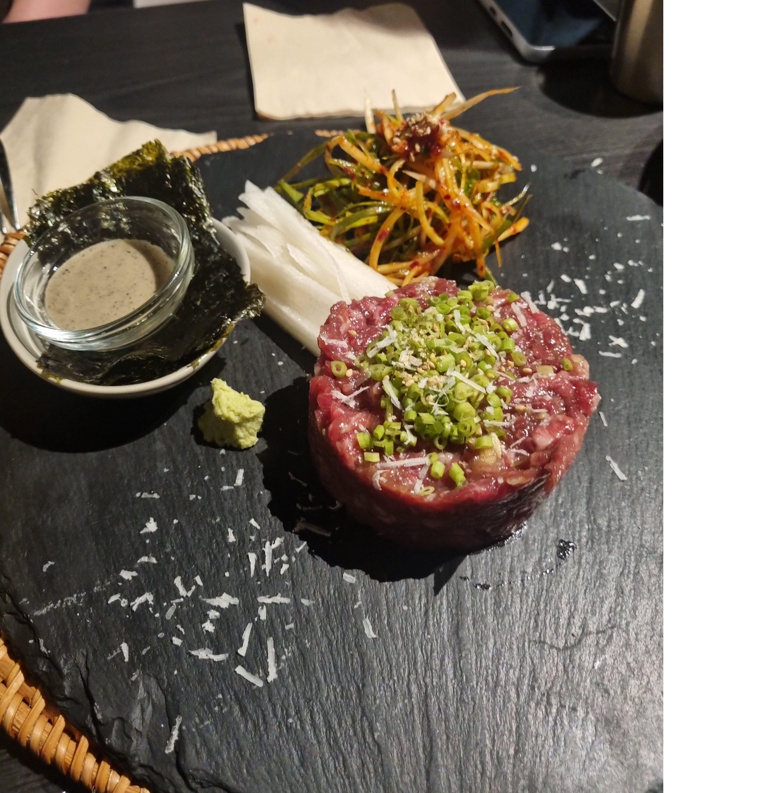 육회 자체가 신선해서 고소하고 부드러웠고, 함께 나온 아삭한 배와 매콤한 미나리무침, 김과 와사비까지 곁들이면 맛이 폭발적으로 살아났어요. 김 위에 육회, 배, 미나리, 와사비 살짝 올려 먹는 순간, “아, 이게 바로 완벽한 한입”이라는 말이 절로 나왔죠.