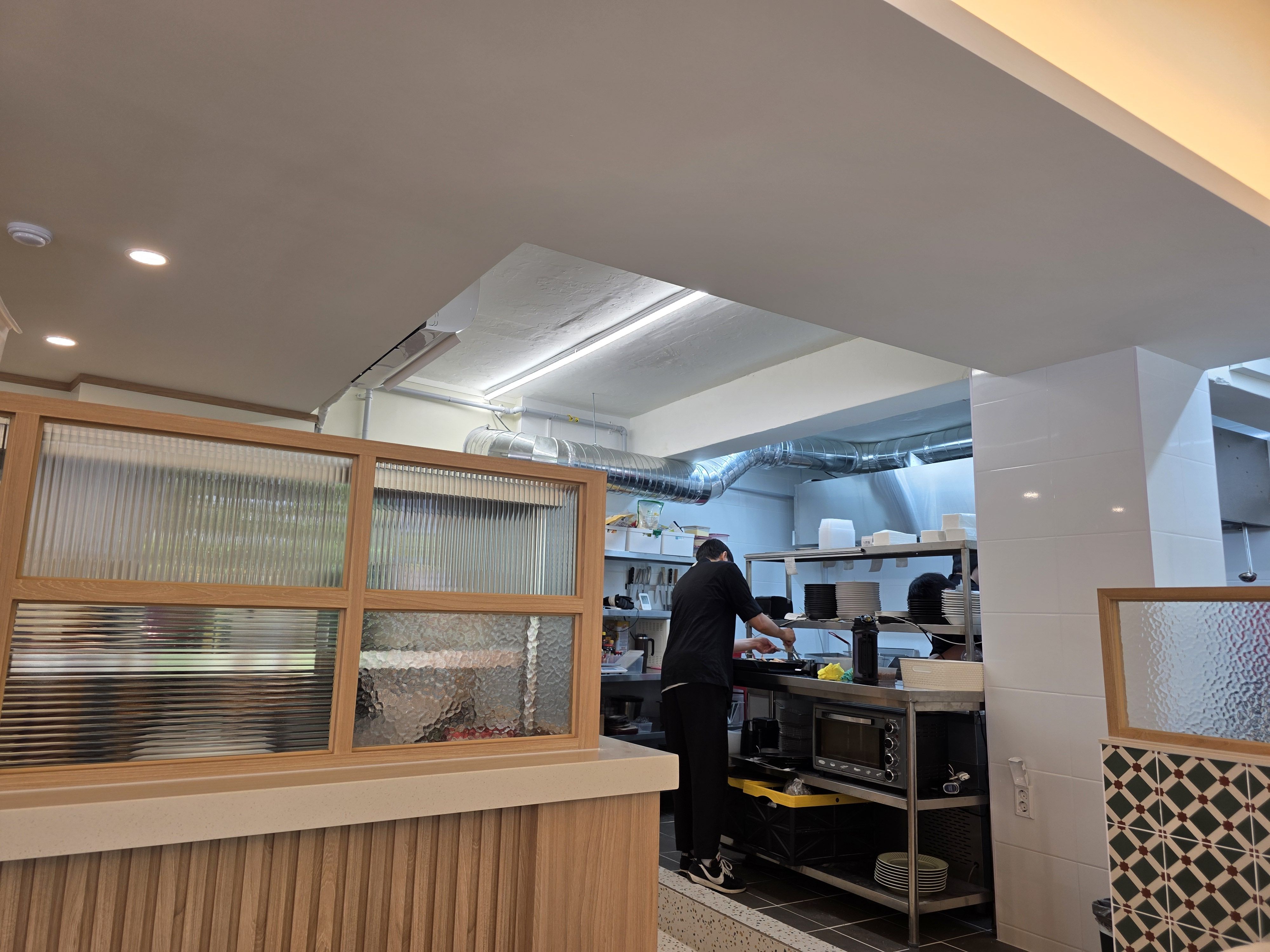 실내는 우드톤 인테리어에 은은한 조명이 어우러져 따뜻하고 아늑한 분위기였어요. 창가 쪽에는 화분이 놓여 있어 답답하지 않고, 햇살이 들어오면 은근히 브런치 카페 느낌도 났습니다. 테이블 간격은 살짝 좁은 편이라 붐빌 때는 옆자리랑 가까워서 프라이빗한 분위기는 덜할 수 있어요. 하지만 친구들이랑 가볍게 모여 식사하기엔 충분히 괜찮았어요.