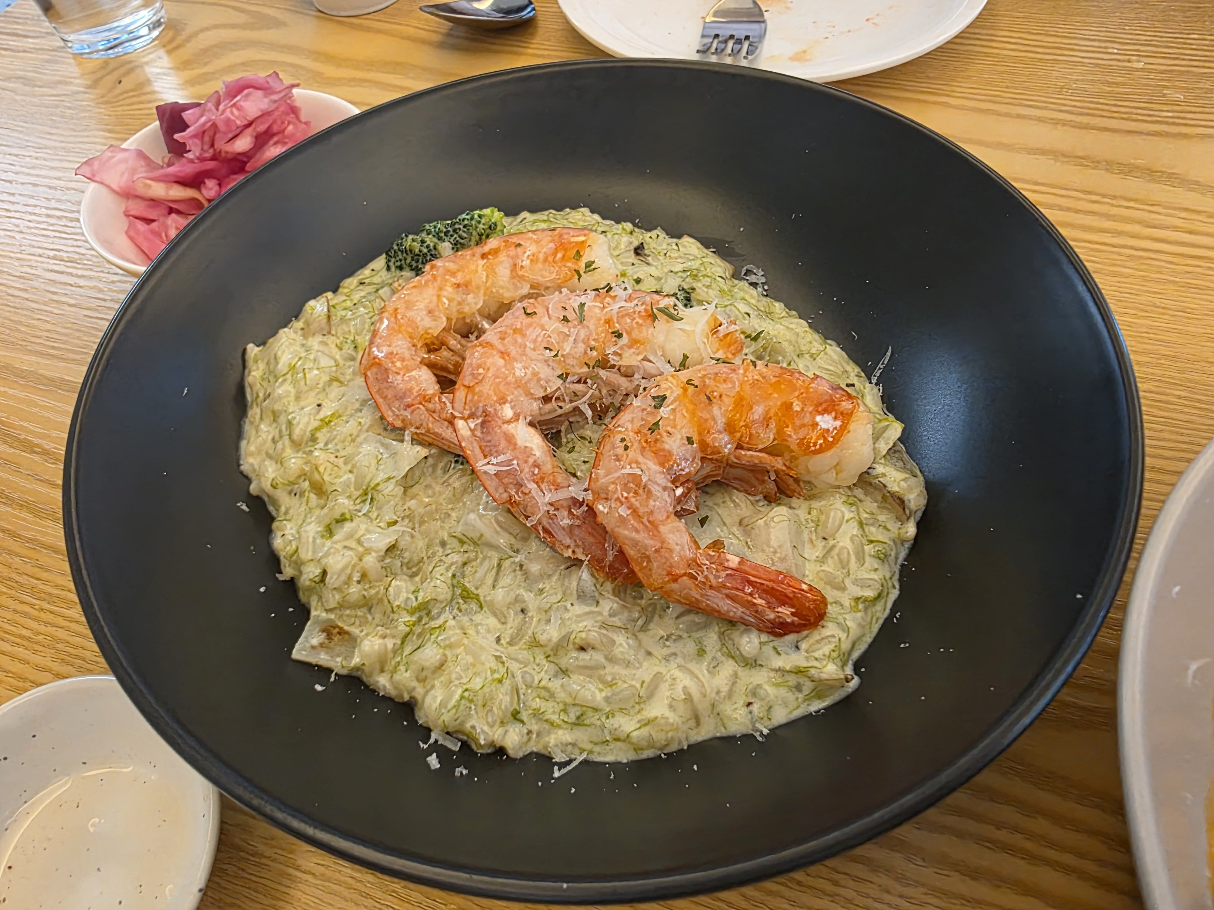 크림 베이스 리조또에 새우가 올라가 있는 메뉴였는데, 의외로 조합이 나쁘지 않았습니다. 새우 자체는 탱글했고, 감태 크림소스가 고소하면서도 약간의 바다향을 더해 주더라고요. 다만 밥알이 살짝 퍼져 있어서 리조또라기보단 죽에 가까운 느낌이 나는 건 아쉬웠습니다.
