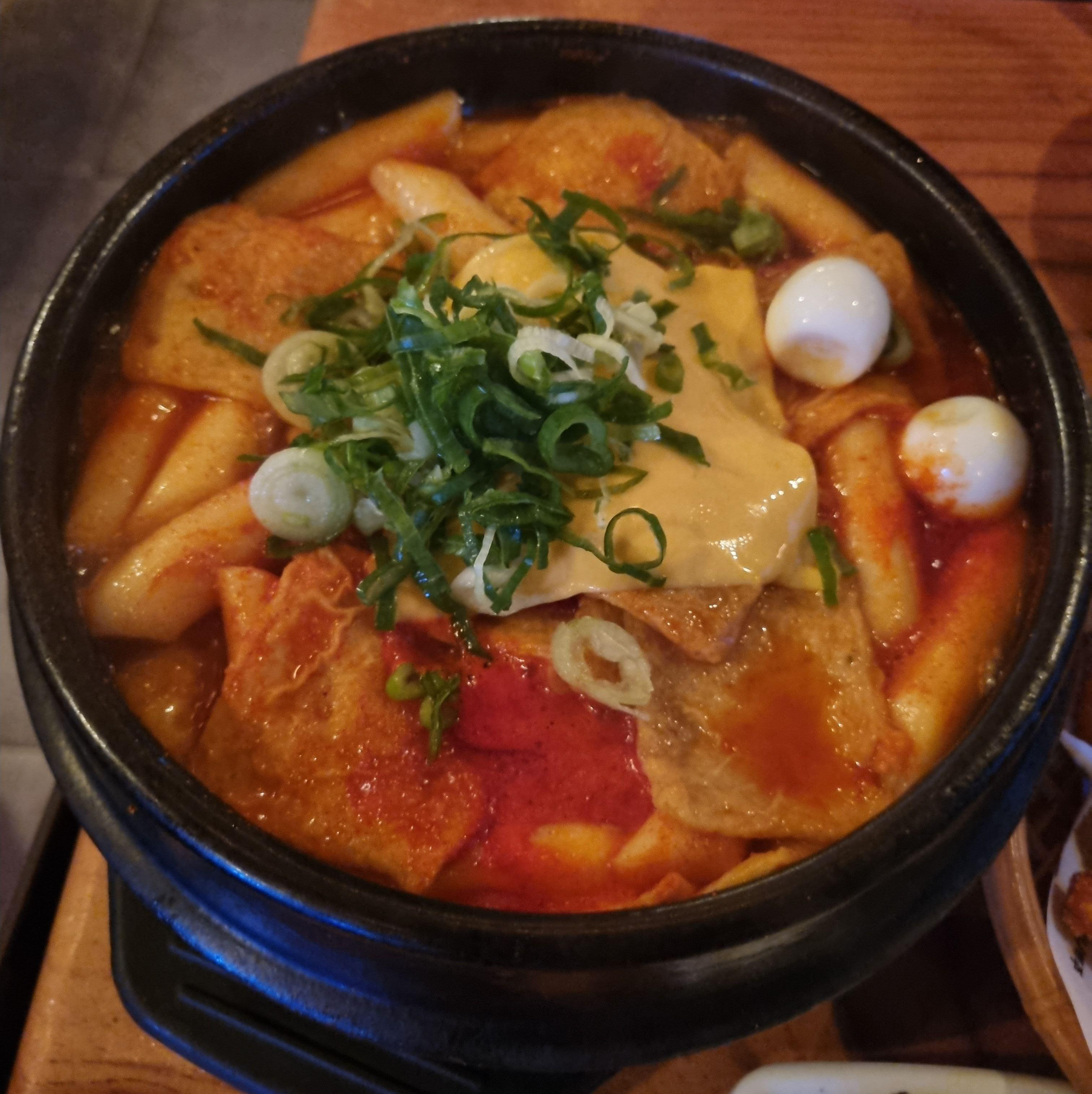뜨겁게 달궈진 뚝배기 안에 떡과 어묵이 푸짐하게 들어있고,