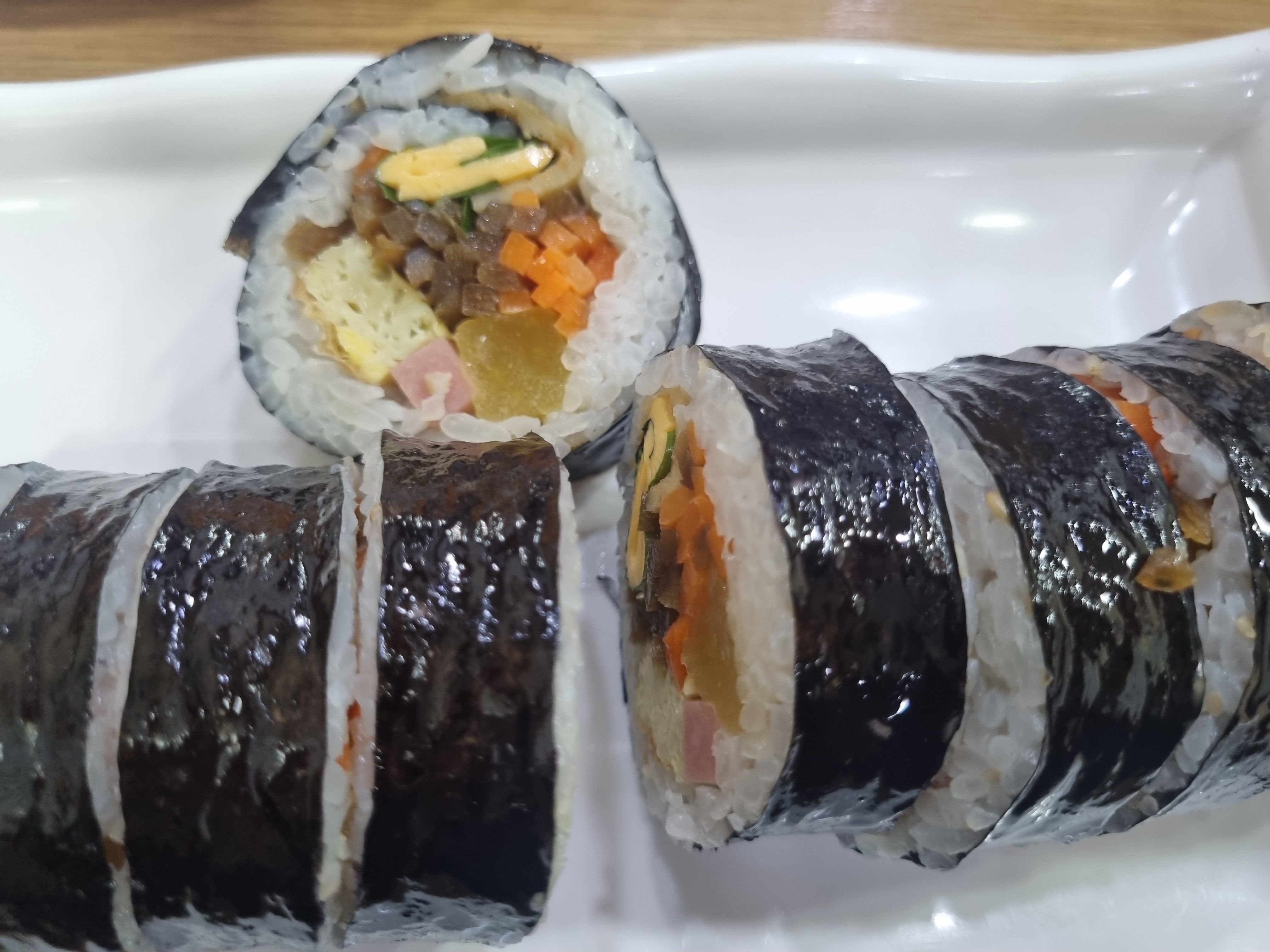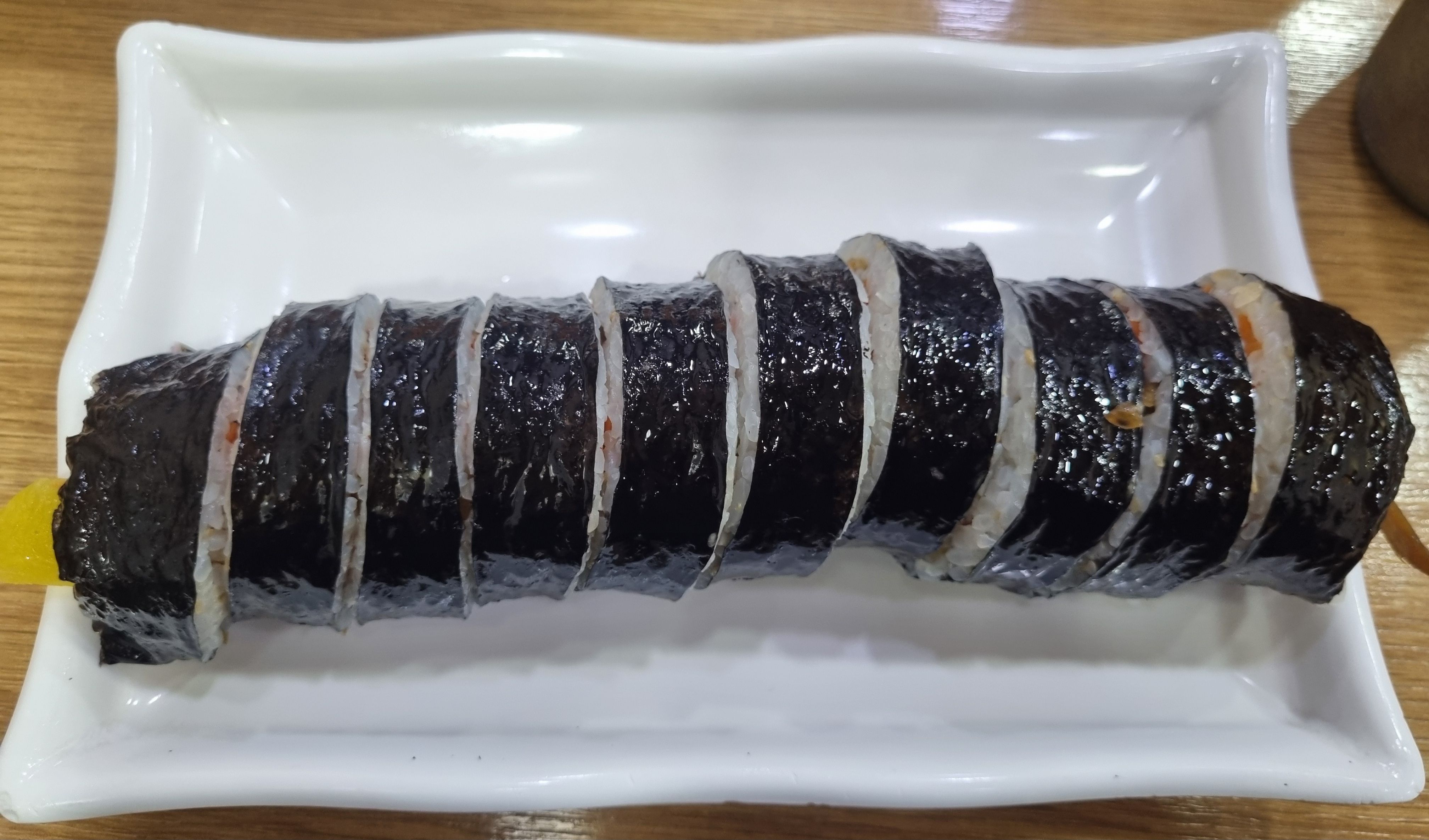 먼저 나온 건 김밥 한 줄. 반짝이는 김 위로 참기름 향이 솔솔 올라오고, 단무지가 살짝 보이네요.