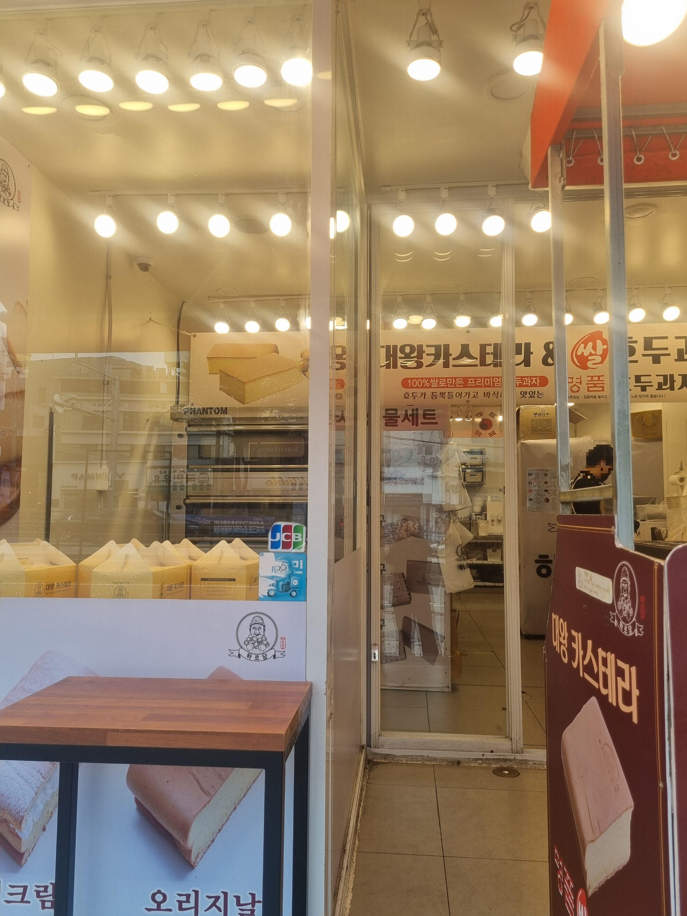 간판에 “대왕카스테라 & 쌀호두과자” 큼지막하게 적혀 있고,
